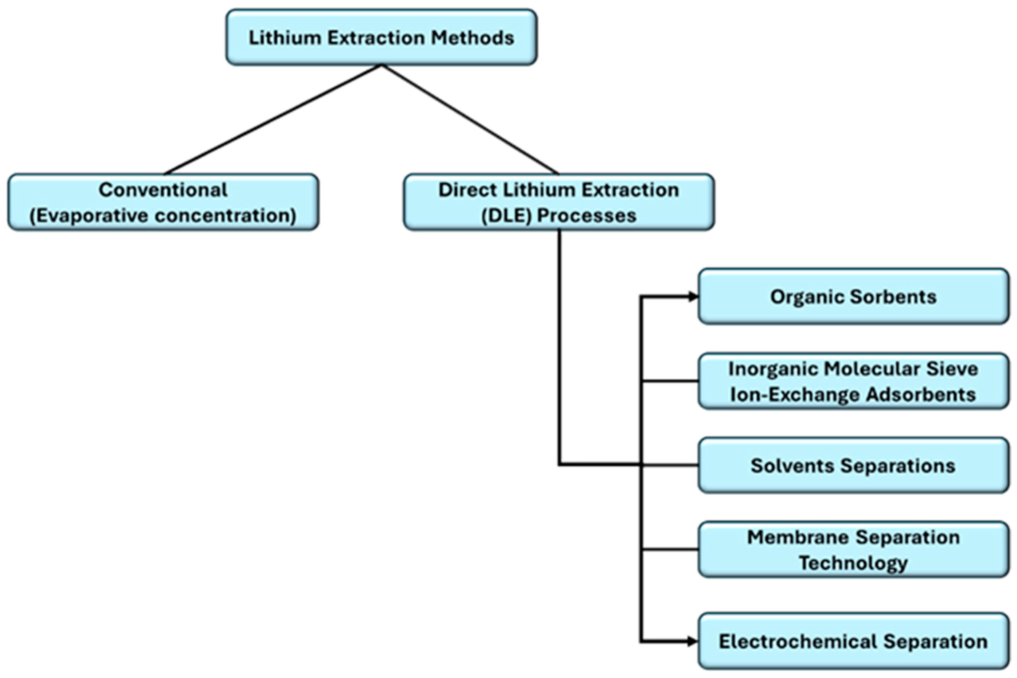 This traditional technological process (Figure 5) has disrupted fragile ecosystems in already arid regions [89,90] causing severe environmental impacts [41]. Additionally, countries are developing policies on brine extraction [91]. This has created a need for shorter, less harmful technological processes known as direct lithium extraction methods: a list of advanced techniques for relatively safe and rapid lithium extraction from brine [92]. Figure 6 shows the classification of lithium extraction processes.