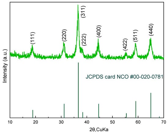 X-ray diffraction (XRD) confirmed the formation of a crystalline spinel NiCo2O4 phase, with sharp reflections corresponding to the (111), (200), (220), (311), and other characteristic planes (Figure 1). The dominance of the (311) peak and absence of secondary phases indicate high phase purity and preferential orientation. This crystallinity, achieved via low-temperature inkjet printing, rivals that of NiCo2O4 synthesized through hydrothermal or sol–gel methods [5,8], while remaining compatible with flexible substrates.