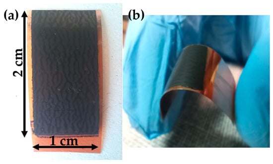 Kapton films (85 μm thick) were cut into 2 × 1 cm2 pieces and cleaned sequentially with acetone, isopropanol, and deionized water, followed by drying under a nitrogen stream. A 20 nm thick gold layer was deposited onto the Kapton surface using a metal sputter coater ensuring optimal conductivity and adhesion. The Au layer was sputter-deposited on the Kapton substrate at ambient temperature. Although no thermal analysis was performed in this study, Kapton’s thermal stability is well documented in the literature, with decomposition temperatures typically above 500 °C [45].