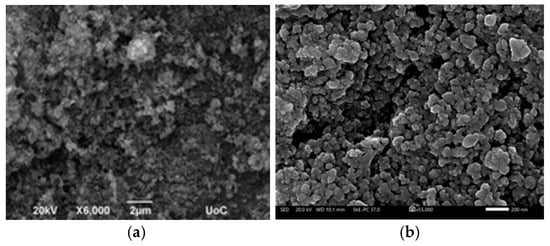 Scanning Electron Microscopy (SEM) revealed a porous, granular morphology composed of irregularly shaped NiCo2O4 particles (Figure 3). Particle sizes ranged from 200 to 800 nm, with agglomerates reaching up to 2 μm. After mechanical grinding, the particles exhibited a more uniform distribution below 200 nm, with average diameters reduced from ~450 nm to ~60 nm. This refinement enhances surface homogeneity and increases the electrochemically active area, facilitating ion transport and redox reactions. The porous architecture supports electrolyte penetration and is consistent with pseudo-capacitive behavior.