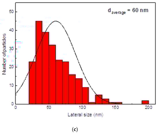 Surface morphology of the electrodes was investigated using Scanning Electron Microscopy (SEM), presented in Figure 3. The micrographs (Figure 3a,b) reveal a rough, granular texture composed of interconnected nanoscale particles, forming a porous network across the Au/Kapton substrate. Figure 3b shows a high-magnification SEM image of the NiCo2O4 film, revealing its nanoparticulate structure which is beneficial for ion transport and electrochemical activity. Figure 3c presents the associated particle size analysis, confirming that the particle size in the film (average diameter 60 nm) remains almost the same as in the ball-milled powder. The NCO particles exhibit irregular shapes and a porous morphology, with average diameters ranging from 200 to 800 nm. In some regions, agglomerates reach sizes of 1–2 μm, indicating localized clustering. Following mechanical grinding, the NCO nanoparticles achieve a more uniform size distribution, with diameters reduced to below 200 nm. The average particle size decreases from approximately 450 nm to 60 nm, representing a mean reduction of about 385 nm as shown in Figure 3b (high resolution SEM) and 3c (histogram of particle size analysis), in excellent agreement with similar films prepared on glass substrates and presented in [1]. The average particle size decreases from approximately 450 nm to 65 nm, representing a mean reduction of about 385 nm. This refinement enhances surface homogeneity and increases the electrochemically active area, which is beneficial for ion transport and redox activity [8,27,30]. The uniform distribution of particles and absence of cracks or delamination indicate strong adhesion and consistent film formation, both critical for mechanical stability in flexible devices [9,26]. The observed surface features are characteristic of pseudo-capacitive materials and support efficient electrochemical performance [10,28].