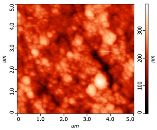 Atomic Force Microscopy (AFM) was employed to assess the topography of the printed NiCo2O4 layer, as shown in Figure 4. The 2D surface profile reveals nanoscale roughness with height variations ranging from 0 to approximately 300 nm. The presence of elevated regions and valleys suggests a textured surface that enhances electrolyte contact and charge storage capacity [30]. The AFM micrograph also reveals a homogeneous and compact film with pronounced nanoroughness, indicating uniform deposition and strong surface cohesion. This topographical complexity complements the SEM findings and confirms the formation of a uniform, high-surface-area film. Together, the XRD, SEM, and AFM analyses demonstrate that inkjet-printed NiCo2O4 on Au/Kapton exhibits the structural and morphological characteristics necessary for high-performance flexible supercapacitor electrodes [8].
