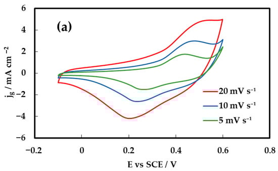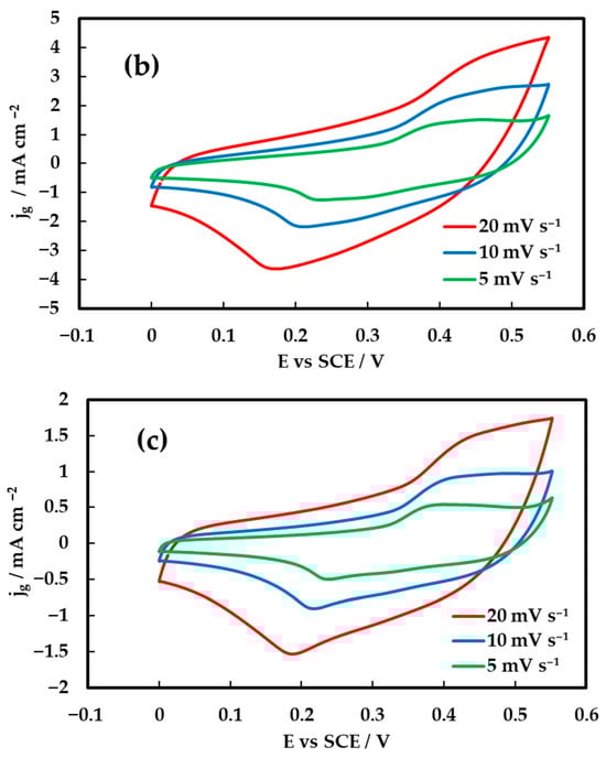 Cyclic voltammetry (CV) was employed to evaluate the capacitive behavior of the inkjet-printed NiCo2O4 electrodes on Au/Kapton substrates as a function of the number of printed catalyst layers. Figure 5 presents the CV responses of the electrode composed of two, six and ten printed layers (corresponding to 0.1, 0.3 and 0.5 mg cm−2 loadings), recorded at scan rates of 5, 10, and 20 mV s−1 within the potential window of 0–0.55 V vs. SCE. The voltammograms exhibit quasi-rectangular shapes with distinguishable redox peaks, indicating the coexistence of electric double-layer capacitive and pseudocapacitive behavior. This hybrid charge storage arises from additional reversible faradaic reactions of Ni2+/Ni3+ and Co2+/Co3+ redox couples. Specifically, the nickel-based redox process follows: