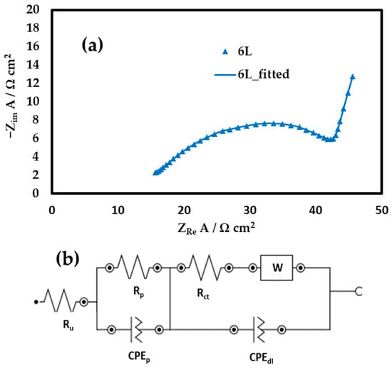 EIS measurements (Figure 6a) and subsequent analysis (Figure 6b) were carried out at the open circuit potential of the optimum 6 L electrode (+0.50 V vs. SCE). The recorded arc is associated with a charge transfer resistance (Rct) that may be attributed to Co and Ni redox transformations (change in oxidation state) under kinetic control, followed by a linear tail at low frequencies, indicative of a diffusion-controlled processes (Warburg impedance), most likely corresponding to OH− diffusing through the pores (reactions corresponding to the chemical Equations (1), (3) and (4)).