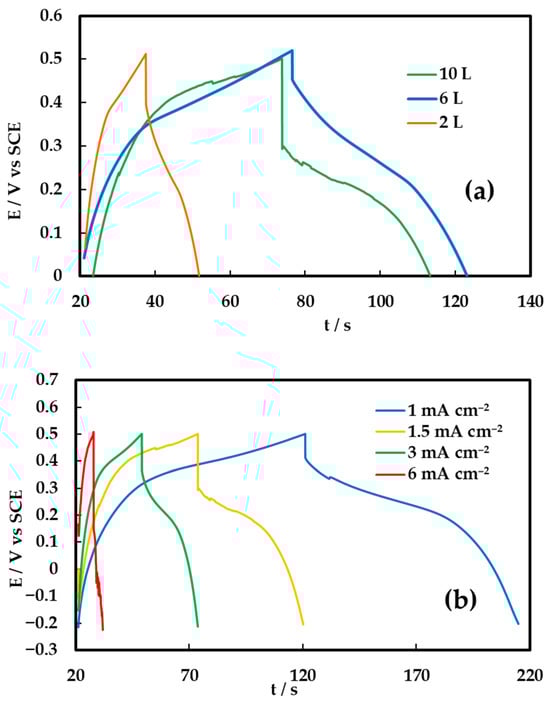 The electrode with 10 printed layers exhibits the longest discharge duration, yielding the highest areal capacitance of 172 mF cm−2, followed by the 6-layer and 2-layer electrodes with values of 156 mF cm−2 and 56 mF cm−2, respectively. The increase in areal capacitance with layer number is ascribed to the greater amount of electroactive material available for charge storage. However, normalization with respect to the active material mass yields a partially reversed trend in mass-specific capacitance, with values of 344 F g−1, 521 F g−1, and 503 F g−1 for the 10-, 6-, and 2-layer electrodes, respectively. The superior gravimetric performance of the 6- and 2-layer electrodes suggests more efficient utilization of the active material, likely due to enhanced ion accessibility and reduced diffusion limitations within thinner films. Figure 7b presents the charge–discharge curves of the optimum 6L electrode at various charge–discharge current densities and the same type of behavior is observed at current densities as high as 6 mA cm−2.