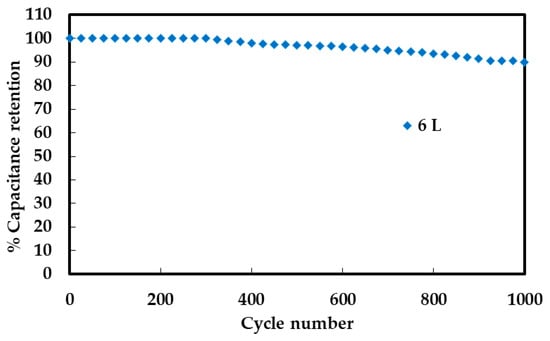 Charge–discharge cycling behavior, assessed through repeated GCD cycles (Figure 8), revealed good retention over time. The 6-layer electrode maintained approximately 90% of its initial capacitance after 1000 cycles. This decline may result from mechanical fatigue, structural degradation, or loss of active sites during repeated charge–discharge processes. Enhancements such as surface passivation, flexible binders, or hybrid composites may be necessary to improve long-term reliability.