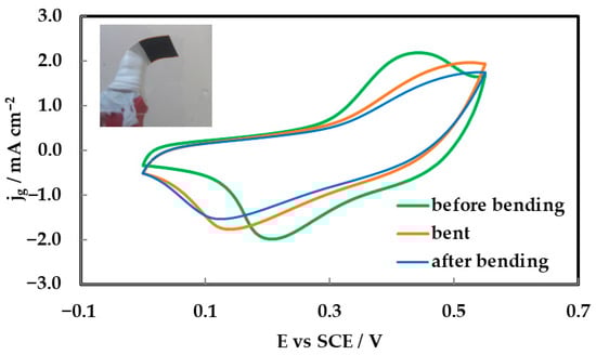 To assess the mechanical flexibility and electrochemical stability of the inkjet-printed NiCo2O4 electrodes deposited on Kapton substrates with a gold (Au) interlayer, cyclic voltammetry (CV) measurements were conducted under three mechanical conditions: prior to bending, during bending, and following bending. The CV profiles, recorded at a scan rate of 5 mV s−1 with a mass loading of 0.3 mg cm−2, are presented in Figure 9 (while the inset shows a photograph of the 90°-bent electrode). All three curves—green (before bending), orange (during bending), and blue (after bending)—exhibit quasi-rectangular shapes with discernible redox features, indicative of pseudo-capacitive behavior governed by fast and reversible faradaic reactions [8,10].