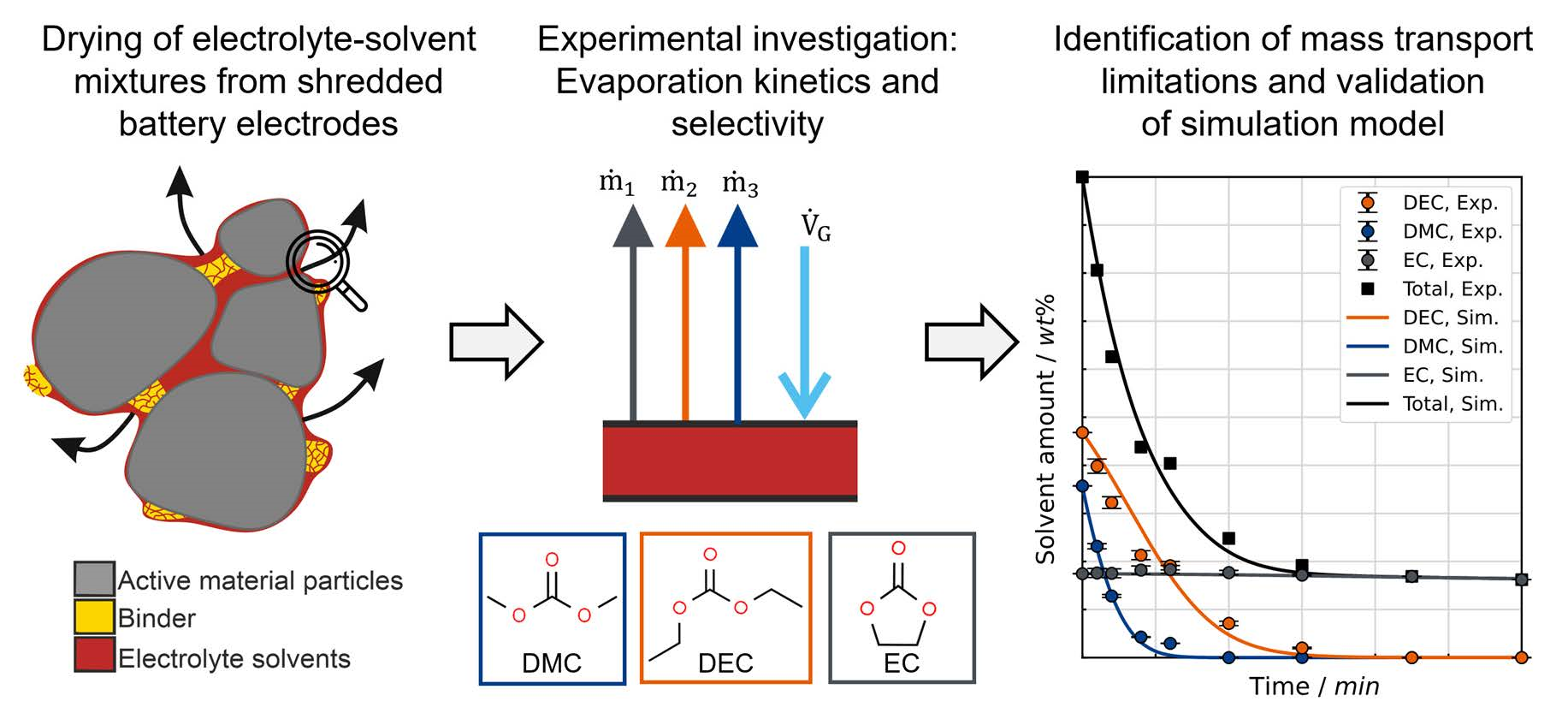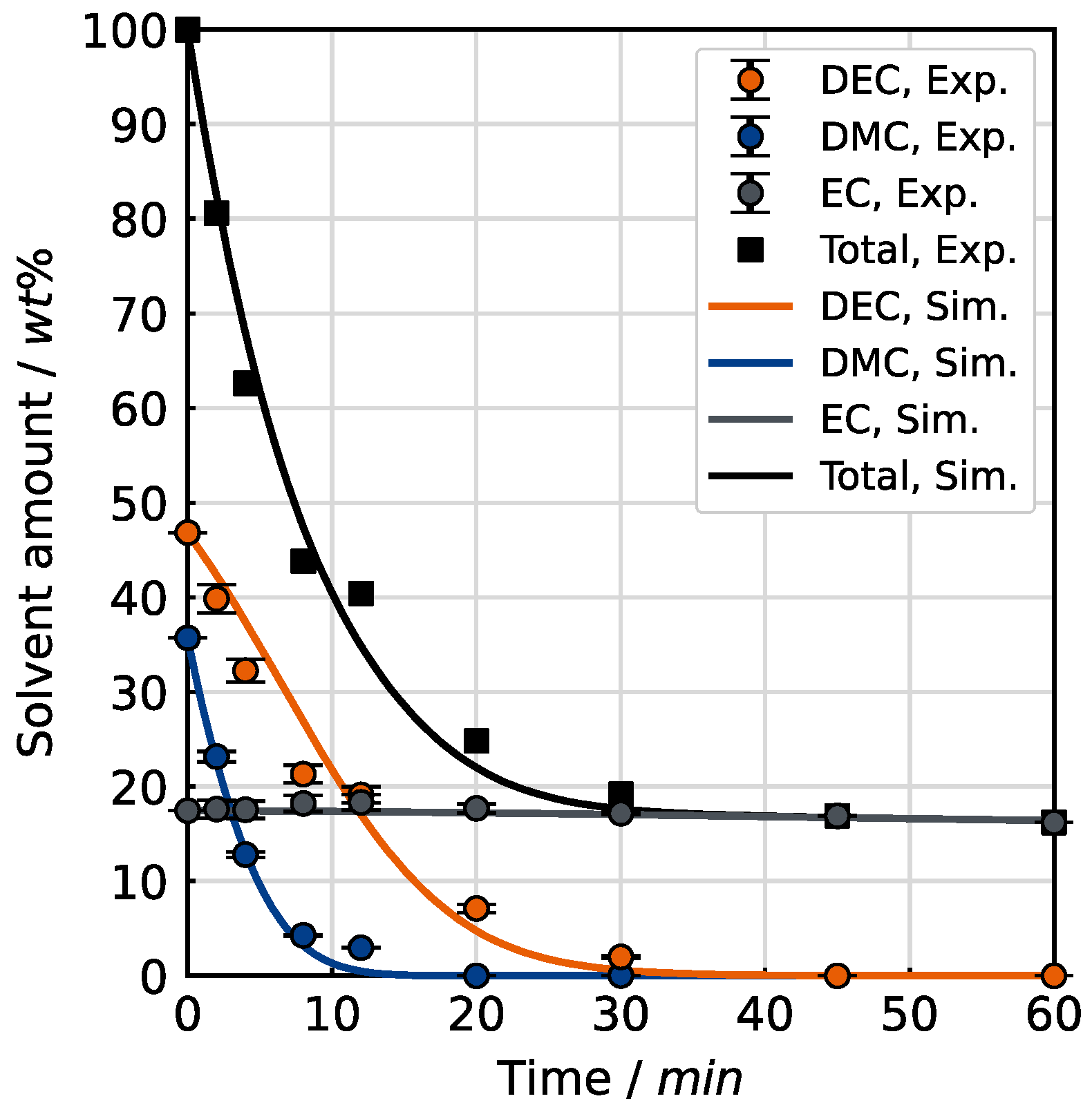 Figure 11 depicts the evaporation kinetics. The measured solvent amount per component is compared to the calculated solvent amount of DMC, DEC and EC taken from the simulation.