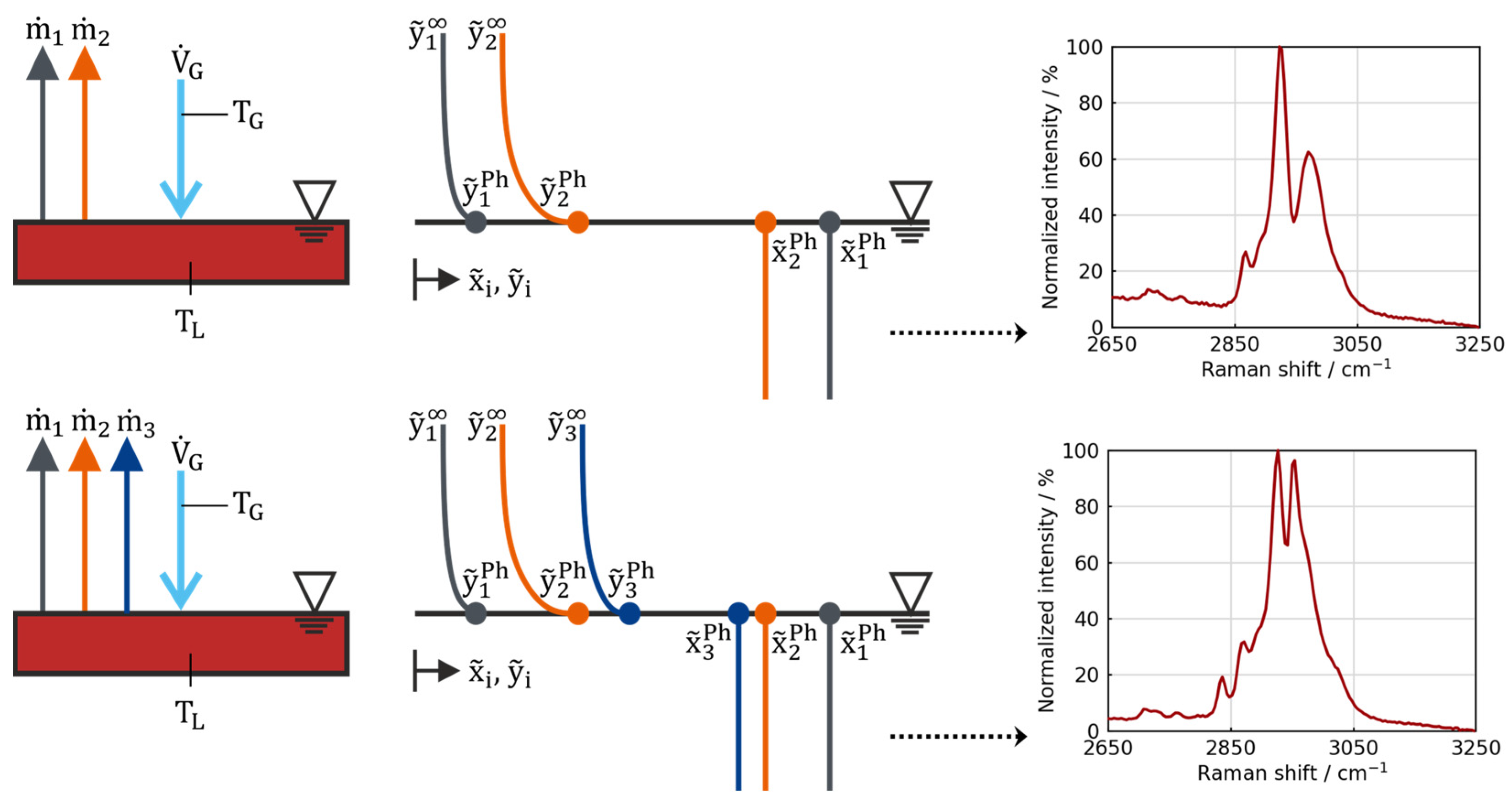 is the ratio of the evaporation flow of component i and the total gas flow, which comprises the cumulated evaporation flows of all species and the carrier gas flow. The stirred liquid phase is assumed to be ideally mixed. To enable the calculation with temperature-independent material properties, the experiments are conducted at isothermal conditions (constant temperature) [