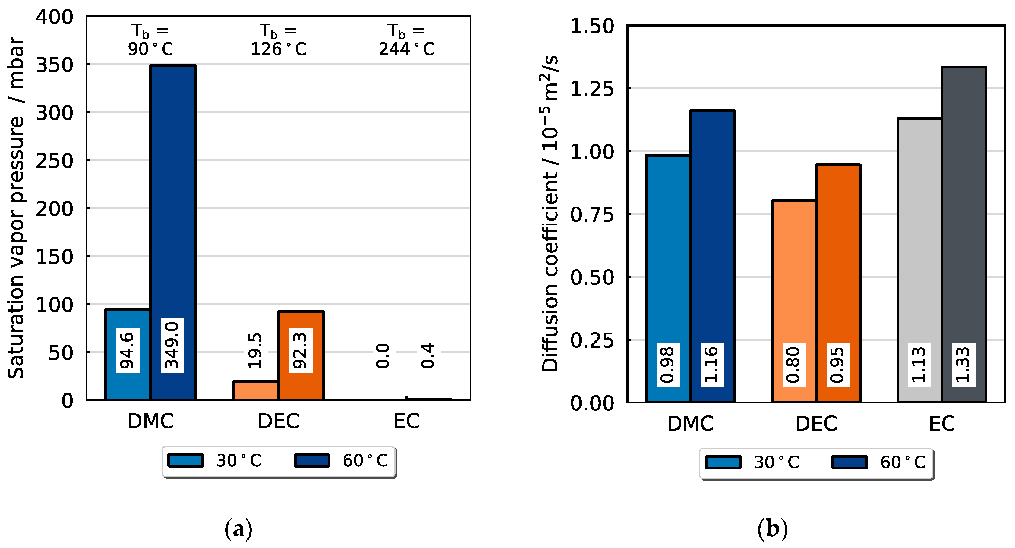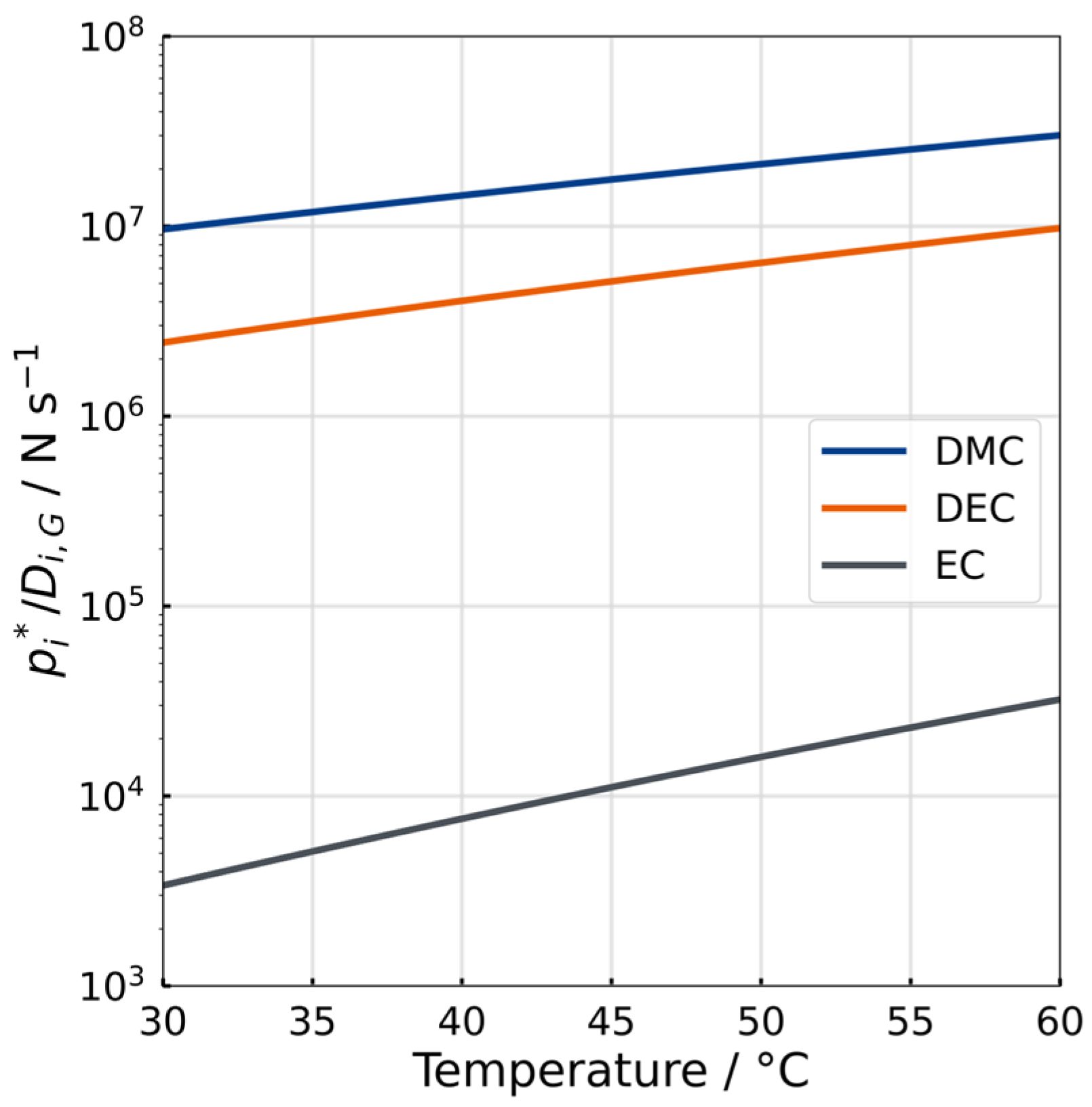 Appendix A), the vapor pressure exhibits a considerably stronger increase with temperature than the diffusion coefficient in the gas phase. The plot displays the exceptionally low vapor pressure of EC for both temperatures. At 30 °C, the ratio of the vapor pressures of DMC and EC is around 2400, then it decreases to around 810 at 60 °C. The ratio of the vapor pressures of DEC and EC is around 100 and 160 at 30 °C and 60 °C, respectively. Therefore, the liquid–gas phase transition of EC is significantly unfavored towards DMC and DEC. While this aspect is apparently crucial for the selectivity of evaporation of the mixture, it should still be noted that EC shows a slight preference in terms of mass transport in the carrier gas flow compared to the other solvents, as can be seen from the diffusion coefficients in the gas phase. The increased mobility of EC is explained by the lower molar weight and molecule size. For both temperatures, 30 and 60 °C, the diffusion coefficient of EC is 1.15 times and 1.41 times that of DMC and DEC, respectively.