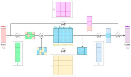 SSMs describe the relationship between the input signal “x(t)” and the output signal “y(t)” through a hidden state “h(t)”, which evolves over time according to a linear dynamical system. The SSM is defined by the following equations: