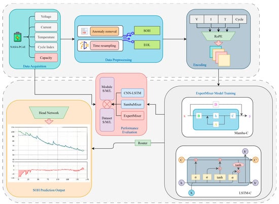 The degradation of the state of health in lithium-ion batteries represents a typical spatiotemporal dynamic process characterized by inherent multi-timescale properties, which pose a fundamental challenge to lifespan prediction. Specifically, battery aging involves not only long-term gradual degradation governed by irreversible mechanisms such as loss of active lithium and deterioration of active materials, but also short-term fluctuations and capacity recovery phenomena induced by internal relaxation processes, including lithium-ion concentration redistribution and dynamic reconstruction of the interface film. Conventional monolithic model architectures often struggle to accurately capture these differentiated dynamics simultaneously: while recurrent neural networks excel at modeling local temporal dependencies, they exhibit limited efficiency in capturing ultra-long-range correlations; meanwhile, emerging state space models demonstrate superior performance on long sequences but lack sensitivity in capturing transient nonlinear dynamics. To address these limitations, this study proposes the ExpertMixer model, whose core design philosophy lies in constructing a synergistic dual-expert system to, respectively, handle degradation patterns across different timescales. Specifically, the Mamba expert, based on a state space model, is designed as a global trend perceiver, aimed at efficiently capturing the macroscopic degradation trajectory spanning the entire battery lifecycle. In contrast, the LSTM expert serves as a local dynamic detector, focusing on extracting mid- to short-term capacity fluctuations and recovery characteristics. To intelligently integrate the strengths of both experts, we introduce a learnable gated fusion mechanism that adaptively adjusts fusion weights based on the real-time characteristics of the input sequence, thereby achieving seamless integration of multi-scale features from global to local levels. Furthermore, considering the physical significance of sampling time points in battery time series (e.g., discharge duration), we adopt a sampling time-based rotary position encoding to deeply embed temporal physical information into feature representations, thereby enhancing the model’s awareness of temporal dynamics. In summary, the architecture design of the ExpertMixer model is grounded in a profound understanding of the physical mechanisms underlying battery aging, with the objective of achieving more robust and accurate estimation of battery state of health through a well-defined and synergistically optimized system.
