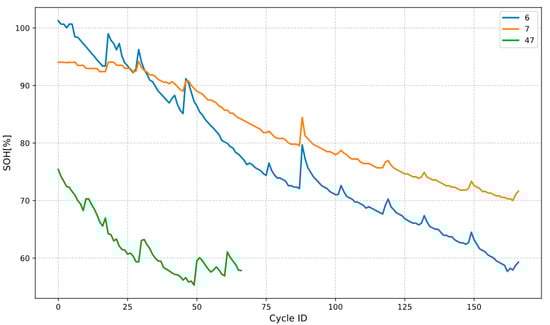 Figure 4 visually demonstrates the capacity fade curves of three test batteries (No. 6, 7, and 47), clearly revealing their distinctly different aging behaviors and degradation trajectories under the same evaluation criteria. Battery 47 exhibits the most severe and nonlinear capacity degradation, showing a rapid deterioration trend accompanied by significant fluctuations, which aligns with its testing environment at 4 °C []. In contrast, Batteries 6 and 7 demonstrate more gradual and linear capacity degradation at 24 °C. All battery curves display varying degrees of capacity recovery phenomena, manifested as local fluctuations and temporary rebounds, which directly reflect the complex internal relaxation processes of the batteries and pose a fundamental challenge to the predictive models’ ability to capture non-stationary dynamics. By visualizing the significant heterogeneity in the aging paths of test batteries, Figure 4 strongly validates the reliability and rigor of subsequent experimental results, indicating that an excellent prediction model must simultaneously adapt to multiple degradation patterns including smooth, severe, and highly fluctuating modes [].