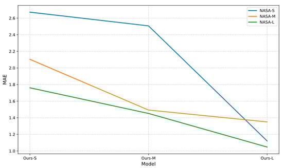 Figure 6 systematically compares the MAE performance of ExpertMixer models with different parameter scales (S, M, L) under various training data sizes (NASA S, NASA M, NASA L). This visualization provides important quantitative evidence for the model scalability analysis in this study. From the vertical dimension analysis, a general scaling effect pattern can be observed: for the NASA-L dataset, the largest-scale model achieves the lowest prediction error, though the relationship is not strictly monotonic as evidenced by the performance variation across different model sizes. Taking the NASA L dataset as an example, the ExpertMixer S model achieves an MAE of 1.120, the ExpertMixer M model reduces it to 1.350, while the largest parameter scale ExpertMixer L model further optimizes the error to 1.047. This regular pattern confirms that increasing model capacity, manifested through larger model dimensions, state dimensions, and deeper network layers, can effectively enhance the model’s feature extraction and representation learning capabilities for complex aging patterns. From the horizontal dimension analysis, the Figure 6 reveals the coupling relationship between data scale and model performance. For the small parameter scale ExpertMixer S model, when training data expands from NASA S to NASA M, MAE significantly decreases from 2.672 to 2.507, indicating that the model still maintains the ability to learn from additional data. However, when further expanding to the NASA L dataset, the performance improvement margin narrows (MAE 1.120), suggesting that its limited model capacity has become a bottleneck for further enhancement. Conversely, the largest parameter scale ExpertMixer L model continues to show significant performance gains when scaling from NASA M to NASA L (MAE decreasing from 1.452 to 1.047), demonstrating that large scale models possess the capability to efficiently utilize abundant data resources. The scientific value of Figure 6 is also reflected in its revelation of the rationality of model architecture design. The performance of different scale models across various data regimes validates the importance of the “model capacity data complexity” matching principle: small scale models (S) are suitable for data scarce scenarios, large scale models (L) can fully exploit the potential of large datasets, while medium scale models (M) provide a balanced option between computational efficiency and performance. This hierarchical design offers theoretical guidance for selecting appropriate model scales based on data resource constraints in practical applications. Furthermore, the patterns demonstrated in the Figure 6 corroborate the quantitative results in Table 5 and Table 6, collectively forming a complete evidence chain for model scalability research. These findings not only validate the effectiveness of the ExpertMixer architecture design but, more importantly, provide essential design guidelines for the application of deep learning in battery health prediction: by systematically expanding both model scale and dataset scale, the theoretical upper limit of prediction performance can be continuously improved.