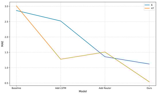 This section evaluates the contribution of individual modules in the proposed method through ablation studies. Unless otherwise specified, all experiments were conducted using the ExpertMixer-L model trained on the NASA-L dataset. The analysis focuses on two key components within the model backbone network: the LSTM channel mixing module and the expert fusion module. As shown in Figure 7, Experimental data clearly demonstrates that the complete ExpertMixer architecture achieves optimal performance across all three test batteries, confirming the rationality of the overall design. Specifically, when using only the LSTM module, the model shows relatively good performance on test battery 47, benefiting from LSTM’s advantage in medium short-term sequence modeling that effectively captures local fluctuation features such as capacity recovery. However, its performance significantly decreases on test batteries 6 and 7, indicating that relying solely on LSTM is insufficient for effectively modeling long-range dependencies. Conversely, when employing only the Mamba module, the model demonstrates advantages in long-sequence modeling but shows inadequate performance in handling the complex nonlinear fluctuations of battery 47, revealing the limitations of pure state space models in capturing fine-grained temporal features. The most compelling evidence comes from ablation studies of the expert fusion module. When replacing the learnable gating mechanism with simple feature concatenation or weighted averaging, model performance significantly declines, directly demonstrating the necessity of dynamic adaptive fusion strategy. The learnable gating mechanism automatically adjusts the contribution weights of both expert networks according to input sequence characteristics, enabling adaptive matching to different aging patterns.