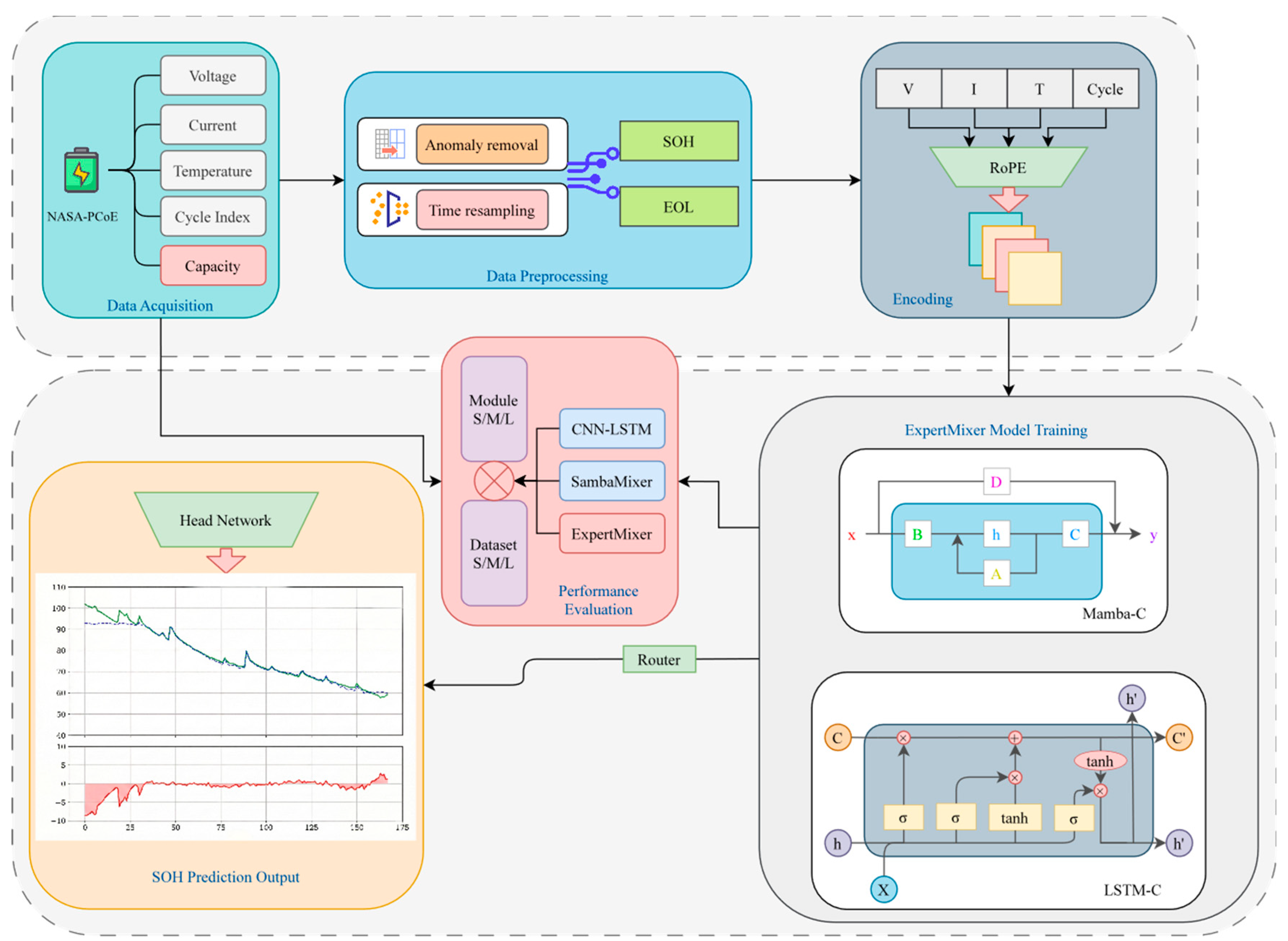 - Ignacio, O.J.; Sascha, K.; Clara, P.; Sergio, M. SambaMixer: State of health prediction of Li-ion batteries using Mamba state space models. IEEE Access 2024, 13, 2313–2327. [Google Scholar]