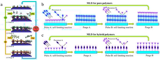 Schematic illustrations of ALD and MLD processes. (a) ALD process, which is exemplified by the ALD Al2O3 using TMA and water as precursors [] and MLD processes of (b) pure polymers using two homobifunctional precursors and (c) organic–inorganic hybrid materials using an ALD precursor and an MLD precursor []. Reprinted with permission from Ref. []. Copyright (2012) John Wiley & Sons. Reprinted with permission from Ref. []. Copyright (2024) Royal Society of Chemistry.