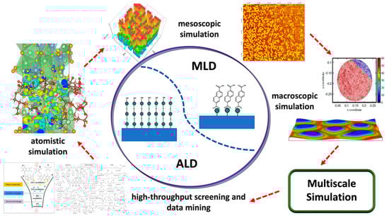 For ALD/MLD applications in batteries, ideally, a bottom-up cell fabrication and nanopatterning technique (e.g., area-selective ALD/MLD) [] could be used, as a well-tuned functional technique, as inspired by the semiconductor industry. To achieve this new bottom-up paradigm in electrode patterning and cell fabrication, an exhaustive basic understanding of materials properties and synthesis processes from an atomistic to macroscopic scale is needed [,]. To aid the experimental studies, computational studies using multiscale simulation (Figure 2) address the issues while simultaneously examining the materials properties, surface kinetics, and precursor gas flow in reactors during the ALD/MLD synthesis is timely and necessary [,,,,,]. Therefore, alongside advancements in experimental methods and characterization techniques, developing multiscale simulations (Figure 2) is essential for providing high-fidelity, robust design guidelines to optimize the process operation and control during ALD/MLD synthesis in real-world applications.