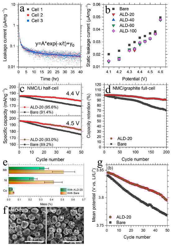 Metal oxides are the most studied ALD coatings for NMCs [], such as Al2O3 [], ZrO2 [,], and TiO2 []. In addition, a few studies have also investigated fluorides, nitrides, and phosphates as the surface coatings of NMC cathodes, e.g., AlF3 [], AlWxFy [], TiN [], and AlPO4 [,]. These materials are inert to electrolytes and can constitute a protective layer between NMC cathodes and electrolytes. They could reduce undesirable interfacial reactions, suppressing dissolutions of TM ions, inhibiting oxygen release from NMC lattices, and thereby sustaining the interfacial and structural stability. In this respect, our recent work on TiO2 ALD coatings on NMC622 is one of the representative case studies []. In the study, we studied the effects of different thicknesses of ALD TiO2 on prefabricated NMC622 electrodes directly. The ALD TiO2 film thickness was varied by adjusting ALD cycles (20, 40, 60, and 100). We noticed an island growth of the ALD TiO2 on NMC powders, which implied that the ALD TiO2 grew preferentially on certain locations, such as defective sites. The ALD TiO2-coated NMC622 electrodes were tested in NMC/Li half-cells. We found that the cells with an ALD-coated electrode have a lower static leakage current, compared to the cells with a bare electrode. The static leakage current is an indicator of interfacial parasitic reactions. We measured the static leakage current using a home-built high-precision leakage current measurement system to quantify the rate of solvent oxidation at different potentials. Figure 3a shows examples of the obtained current relaxation curves of three exemplary NMC/Li half cells. The cells were held at a constant potential of 4.4 V vs. Li/Li+ for 40 h so that the state of charge (SoC) or lithium concentration in the working electrode remained unchanged. The initial high current is due to the charging of the double-layer capacitor and/or the working electrode, while the relatively flat region was related to any gain of electrons from the oxidation of the electrolyte solvent. An exponential decay function (inset of Figure 3a) is used to extract the static leakage current (y0) from the current relaxation curves. The resultant static leakage current value is used as a quantitative indicator of the rate of the solvent oxidation reaction. We found that, by performing a series of potentiostatic hold experiments from 4.1 to 4.6 V vs. Li/Li+, we found that the static leakage current values (y0) increase with increased potentials, indicating the severe electrochemical oxidation of electrolyte components at the surface of the NMC (Figure 3b). Compared to bare NMC, all the ALD-modified NMC samples have smaller static leakage currents. Particularly, we found that a coating of 20 ALD TiO2 cycles could effectively alleviate the electrolyte oxidation, while a thicker coating was not helpful for further reducing static leakage currents. We also investigated NMC/Li half cells and demonstrated that the 20-cycle ALD TiO2 coating (i.e., ALD-20) evidently improved the cell capacity retention at both 4.4 and 4.5 V versus Li/Li+ (Figure 3c). Furthermore, we also confirmed the beneficial effects of the ALD-20 electrodes in the NMC/graphite full cells (Figure 3d). To address the benefits of the ALD TiO2 coating, we measured the amounts of TMs (i.e., Ni, Mn, and Co) on the graphite anodes after cycling and noticed that there were much fewer TMs on the graphite side in the cells using an ALD-coated NMC electrode (Figure 3e). This should be attributed to the reduced dissolution of TMs by the ALD coating. Furthermore, we also witnessed that the ALD coating inhibits microcracking by improving the mechanical properties of the coated electrodes (Figure 3f). Furthermore, we found that the ALD coating could suppress the decay of the average discharge voltage (Figure 3g). These findings reflect that the ALD coating boosts the structural stability of the NMC622 electrodes. In the previous work, it was clearly demonstrated that the ALD technique provides a useful pathway to achieve accurate interface engineering, while the ALD TiO2 coating exhibits multiple benefits through forming a protective oxide layer between the NMC cathode and the electrolyte, including inhibiting interfacial parasitic reaction, boosting the NMC cathode’s mechanical integrity, suppressing dissolution of TM ions, and reducing microcracking of cathode.