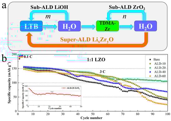 While the aforementioned coatings did help improve the performance of NMC cathodes, they were also exposed to their limited conductivity. The low ionic conductivity of ALD surface coatings could slow the diffusion of Li ions out/in the cathode during charge/discharge processes [,]. To this end, there has been an increasing interest in developing Li-ion conductors as surface coatings of NMCs, such as Li3PO4 [,], LiTaO3 [], LixZryO [], and LiAlF4 []. Particularly, computational calculations have revealed that, compared to binary oxides, Li-containing counterparts could enable better ionic conductivity []. To illustrate the benefits of these Li-containing coatings, we have conducted two studies on the ALD ZrO2 [] and LixZryO [] coatings recently. To produce LixZryO coatings, we developed a super-ALD process through combining two sub-ALD processes of LiOH and ZrO2, as illustrated in Figure 4a. The LiOH sub-ALD [] adopted lithium tert-butoxide (LTB) and H2O, while the ZrO2 sub-ALD [] used tetrakis(dimethylamido)zircominum (TDMA-Zr) and H2O as the precursors. In experiments, the LiOH and ZrO2 sub-ALD processes could be tuned in their sub-ALD cycles, m and n, respectively. The different m/n ratios could result in different LixZryO in composition. To study the effects of different LixZryO in composition, we investigated 1:1 and 1:2 LixZryO (i.e., 1:1 and 1:2 LZO) as the coatings of prefabricated NMC622 electrodes. We found that the 1:1 ALD-LZO coating could remarkably improve the insertion and extraction rates of Li ions across the cathodes. We further found that the 20-cycle 1:1 LZO could lead to the best performance, as shown in Figure 4b. Compared to the results of the ALD ZrO2 coatings of different thicknesses [], the 20-cycle 1:1 LZO coating exhibited a much better performance, in terms of rate capability and long-term cyclability. As illustrated by Figure 4b, specifically, the NMC622 electrode coated by 20-cycle 1:1 LZO could sustain a capacity of >100 mAh g−1 after 100 charge/discharge cycles (Figure 4b), while the NMC622 electrodes coated by ZrO2 could only sustain a capacity of ~80 mAh g−1 after 50 charge/discharge cycles (Inset of Figure 4b). Thus, this confirmed that Li-conductive ALD coatings are more favorable than the ALD coatings with low ionic conductivity, such as ALD ZrO2.