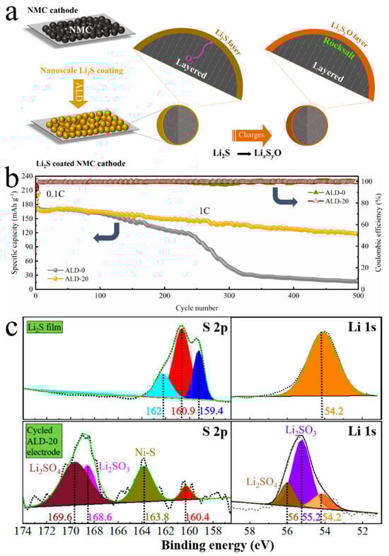 In addition to all the previously discussed oxide coatings, we recently discovered that sulfides are an important class of ALD coatings that have been overlooked []. In contrast to oxides, we discovered that sulfides could play very unique roles and can serve as oxygen scavengers. This new finding is very significant, because the oxygen released from NMC lattices can lead to electrolyte oxidation and produce many detrimental species (e.g., H2O, CO, and CH4). Furthermore, in addition to scavenging oxygen released from NMC lattices, we found that sulfides can convert into stable sulfates. The resultant sulfates can act as chemically and electrochemically stable surface coatings to maintain the interfacial and structural stability of NMC cathodes. Specifically, our recent study clearly demonstrated the sulfide–sulfate conversion using the Li2S ALD coating with the distinct benefits of the sulfide conversion and the resultant sulfate coating []. As illustrated in Figure 5a, we applied a Li2S coating over a prefabricated NMC cathode via an ALD process []. In the following charging process, the oxygen released from the NMC cathode changed the Li2S coating to a LixSyO coating. To verify the benefits of the Li2S coating, a comparative study with Li2S ALD coating on a NMC811 cathode and a bare NMC811 cathode was conducted. The study revealed that, compared to a bare NMC811 cathode (ALD-0), the Li2S coating could help dramatically improve the performance of the Li2S-coated NMC811 cathodes (ALD-20, i.e., 20-cycle ALD Li2S-coated NMC811, Figure 5b) in achieving long-term stable cyclability, accounting for a sustainable capacity of 122 vs. 20 mAh g−1 for Li2S-coated and bare NMC811 electrode after 500 charge/discharge cycles, respectively. Importantly, we first determined that the Li2S-LixSyO conversion with the Li2S coating by analyzing the cycled NMC811 cathodes with X-ray photoelectron spectroscopy (XPS) (Figure 5c). The XPS spectra revealed that, after cycling, the Li2S coating changed from Li2S to Li2SO3 and Li2SO4. We believe that this study unveils a new area for NMC cathode interface engineering, which needs to be further explored. In addition to protecting the electrolyte from oxidation, the resultant LixSyO coating protected the NMC811 from microcracking and mitigated irreversible phase transition. Thus, the Li2S coating helped sustain both interfacial and structural stability of NMC811.