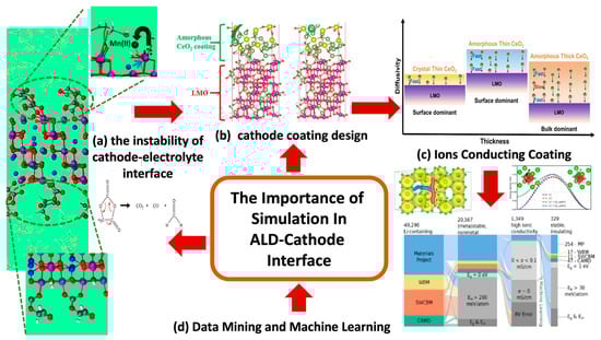 A schematic diagram that highlights the importance of simulation in ALD-cathode interface: (a) mitigate the instability of cathode–electrolyte interface []; (b) improve cathode coating design; (c) search for ion conducting ALD coating based on a systematic study using (d) data mining and machine learning techniques that utilized accurate atomistic simulation data. Reprinted (adapted) with permission from Ref. [] Copyright (2017) ACS Publication.