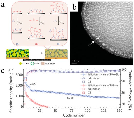 Si as anode promises a very high gravimetric energy density, ~10 times higher than that of commercial graphite anodes (372 mAh g−1). Additionally, it has a low discharge voltage of ~0.2 V versus Li/Li+. On the other hand, Si ranks second in abundance in the Earth’s crust, and this implies its cost-effectiveness. All these benefits jointly make Si an excellent anode candidate for LIBs. Unfortunately, Si experiences large volume changes up to ~300% during the charge/discharge processes in LIBs at room temperature [,]. Such large volume expansion generates many more issues, including electrochemical pulverization, continuous SEI formation, high consumption of electrolytes, and continuous increases in cell impedance. These issues are reflected by rapid cell performance fading and eventually cell failure. In order to tackle these issues, surface coating is effective and serves multifunctional roles, including maintaining the mechanical integrity of Si anodes, suppressing SEI formation, and boosting electrode performance. To this end, many inorganic coatings via ALD have been developed [], but all these attempts have been vulnerable to the weakness of the ALD coatings in terms of elasticity, which makes it impossible to tackle the large volume changes in Si. Previously, we conducted a comprehensive survey on various ALD coatings over Si electrodes, including Al2O3, TiO2, ZnO, HfO2, and TiN []. For more details, readers can refer to the original reference []. Due to their inorganic nature, these ALD coatings generally lack flexibility while having limited elasticity. As a consequence, they find it difficult to accommodate the huge volume changes in Si electrodes. Alternatively, polymeric coatings via MLD were investigated. As an alternative to ALD, Piper et al. [] reported the first attempt to apply a layer of an alucone (denoted as AlGL with a unit structure of [(CH2CHCH2)O3Al) on the prefabricated Si electrodes (Figure 7a). They reported that a 5 nm thick MLD-AlGL coating (Figure 7b) could remarkably boost the coated Si anodes’ performance (Figure 7c). They showed that the AlGL coating could maintain the Si electrode network. Specifically, the MLD-AlGL-coated Si anode only had a 17.5% volume increase after 20 electrochemical cycles, while a 50% volume increase was observed in the bare Si electrode. Thus, this suggests that the MLD-AlGL coating is exceptional in dealing with the extreme volumetric changes in the Si electrodes.