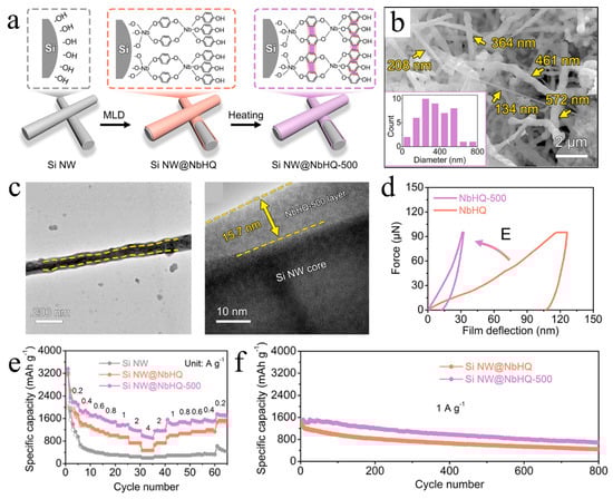 The nanoscale NbHQ niobicone coating helps Si NW electrodes achieve high performance. (a) Schematic illustration of the coating procedures of the MLD NiHQ film on Si NW electrodes. (b) SEM image of Si NW@NbHQ-500 with the inset showing the nanowire diameter distribution. (c) TEM images of Si NW@NbHQ-500. (d) Nanoindentation tests showing load versus displacement curves for NbHQfilm and NbHQ-500 film. (e) Rate capability of the electrodes. (f) Cycling stability of Si NW@NbHQ and Si NW@NbHQ-500 at the current density of 1 A g−1 []. Reprinted with permission from Ref. []. Copyright (2024) Elsevier.