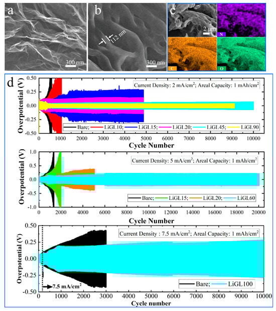 Effects of MLD LiGL on Li-metal anodes []. (a) Bare GNS, (b) GNS coated by 20-MLD-cycle of LiGL, (c) EDX mapping of LiGL-coated GNS, (d) effects of LiGL on Li anodes at different current densities (2, 5, and 7.5 mA/cm2) and a fixed areal capacity of 1 mAh cm−2. The electrolyte is 1M LiTFSI (lithium bis(trifluoromethanesulfonyl)imide) in 1:1 volume ratio of DOL/DME (DOL = 1,3-dioxalane and DME = 1,2-dimethoxyethane). Reprinted (adapted) with permission from Ref. [] under a Creative Commons Attribution (CC BY) license.