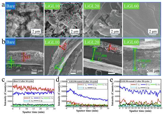 Analyses on cycled Li||Li cells []. SEM images of (a) the surfaces and (b) the cross-sections of the cycled bare, LiGL10, LiGL20, and LiGL60 electrodes after 700 Li-stripping/plating cycles. XPS depth profiling on (c) bare and (d,e) LiGL90 electrodes after (c,d) 10 (e) 50 Li-stripping/plating cycles. The electrolyte is 1M LiTFSI in 1:1 volume ratio of DOL/DME. LiGL10, LiGL20, LiGL60, and LiGL90 indicate the LiGL coatings of 10, 20, 60, and 90 MLD cycles, respectively. Reprinted (adapted) with permission from Ref. [] under a Creative Commons Attribution (CC BY) license.