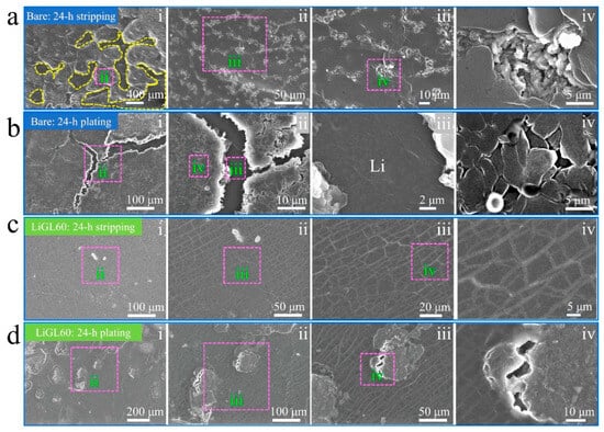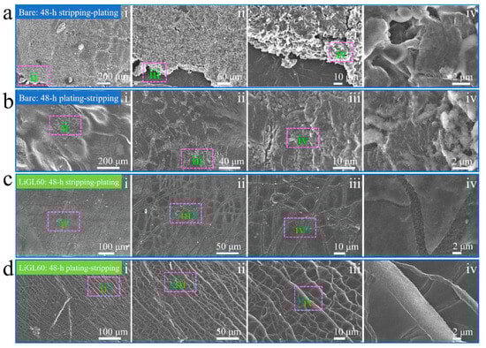 SEM observations of the morphological changes in Li electrodes after 24 h stripping and 24 h plating (or 24 h plating and 24 h stripping) []. (a,b) The bare Li electrode and (c,d) the LiGL60 electrode after one 48 h stripping–plating at 2 mA/cm2. LiGL60 indicates the LiGL coating of 60 MLD cycles. The electrolyte is 1M LiTFSI in 1:1 volume ratio of DOL/DME. Reprinted (adapted) with permission from Ref. [] under a Creative Commons Attribution (CC BY) license.