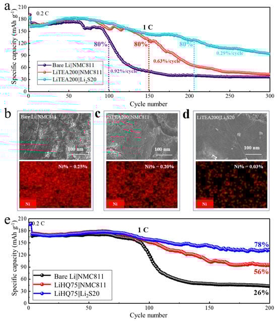 In two subsequent studies [,], LiTEA and LiHQ MLD coatings were developed and coated on Li anodes. These studies revealed that both the LiTEA and LiHQ could evidently improve Li||Li cells’ performance, accounting for ultra-long cyclability of up to 10,000 Li-stripping/plating cycles (>4000 h) without failures at 5 mA cm−2 and 1 mAh cm−2. Similarly to LiGL, it was confirmed that there was little formation of SEI and no dendritic growth under the protection of sufficiently thick LiTEA and LiHQ coatings. According to the authors [,], it was demonstrated that the Li anodes coated with 200 MLD cycles of LiTEA (i.e., LiTEA200, ~72 nm) or 75 MLD cycles of LiHQ (LiHQ75, ~30 nm) could remarkably improve the cyclability of Li||NMC811 (Figure 13). For the NMC811 cathode, which was coated by 20 cycles of ALD Li2S (i.e., Li2S20) [], the resultant LiTEA200||Li2S20 (Figure 13a) or LiHQ75||Li2S (Figure 13e) anode in LMB cells showed a significant improvement in cell cyclability. From the reported results [,], Ni content was detected on the Li anodes after 300 charge/discharge cycles based on energy-dispersive X-ray spectroscopy (EDX), and this is similar to the observation that was found on the Li anodes of bare Li||NMC811 and LiTEA200||NMC811 (Figure 13b,c). Whereas for the Li anode of LiTEA200||Li2S20-NMC811 (Figure 13d), a much lower Ni content from EDX is found. Based on these results (Figure 13), we concluded that it would be most desirable to handle the issues of both Li anodes and cathodes synergically with optimal ALD and MLD coatings.