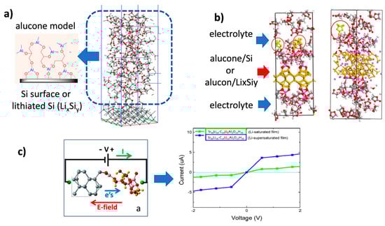 Compared to ALD, a systematic theoretical study of MLD coating on the anode is significantly lacking. For the basic computational study in the synthesis process (Figure 2) and the modulation in materials properties, the reported studies have been mostly focused on ALD, less on MLD [,]. For the pioneering theoretical study on MLD-coated films on a Si anode, the efforts were led by Balbuena et al., with the focus on aluminum alkoxide (alucone) film []. Based on DFT and AIMD simulations, the atomistic models of the alucone MLD layer in contact with the Si (001) surface and the lithiated Si surface (i.e., LixSiy) were proposed and studied (Figure 14a). From DFT calculation, the optimized alucone layer (approximately 3nm thick) exhibits multi-crosslinks and consists of Al-O complexes featuring 3-fold or 4-fold oxygen coordination, as illustrated in Figure 14a. During the lithiation process, it was found that Li atoms bind favorably to the O atoms in alucone, and less into the Si bulk. From DFT calculation [], the strong Li-O interaction in alucone suggests that the Li ions released from the alucone film were less probable. Thus, the alucone film lithiation would proceed to saturation at all favorable sites, and the volume expansion of the lithiated alucone layer would further accommodate the significant volumetric expansion of the silicon anode. Whereas for the alucone-film-coated lithiated silicone (i.e., LixSiy) surface, Li atoms were observed migrating from the lithiated LixSiy surface into the alucone layer, confirming that the alucone film is more favorable for lithiation than either Si or lithiated Si anode surface.