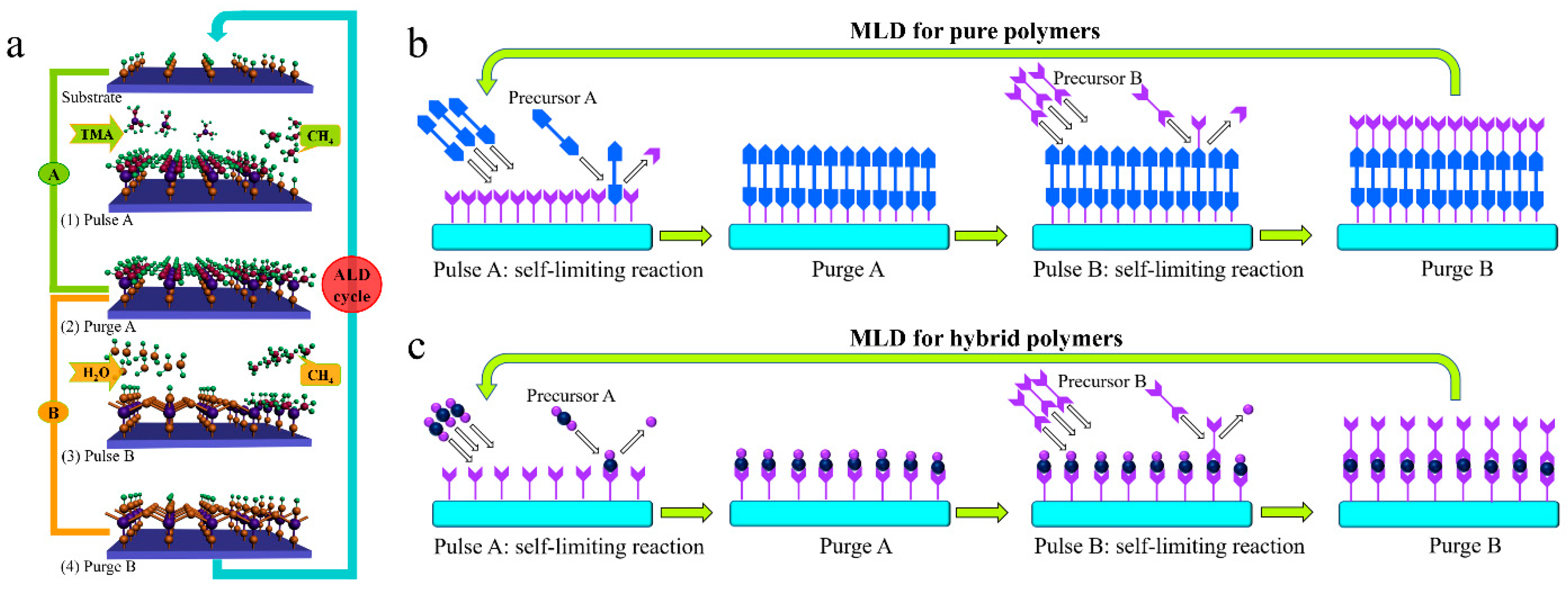 - Meng, X. An overview of molecular layer deposition for organic and organic-inorganic hybrid materials: Mechanisms, growth characteristics, and promising applications. J. Mater. Chem. A 2017, 5, 18326–18378. [Google Scholar] [CrossRef]