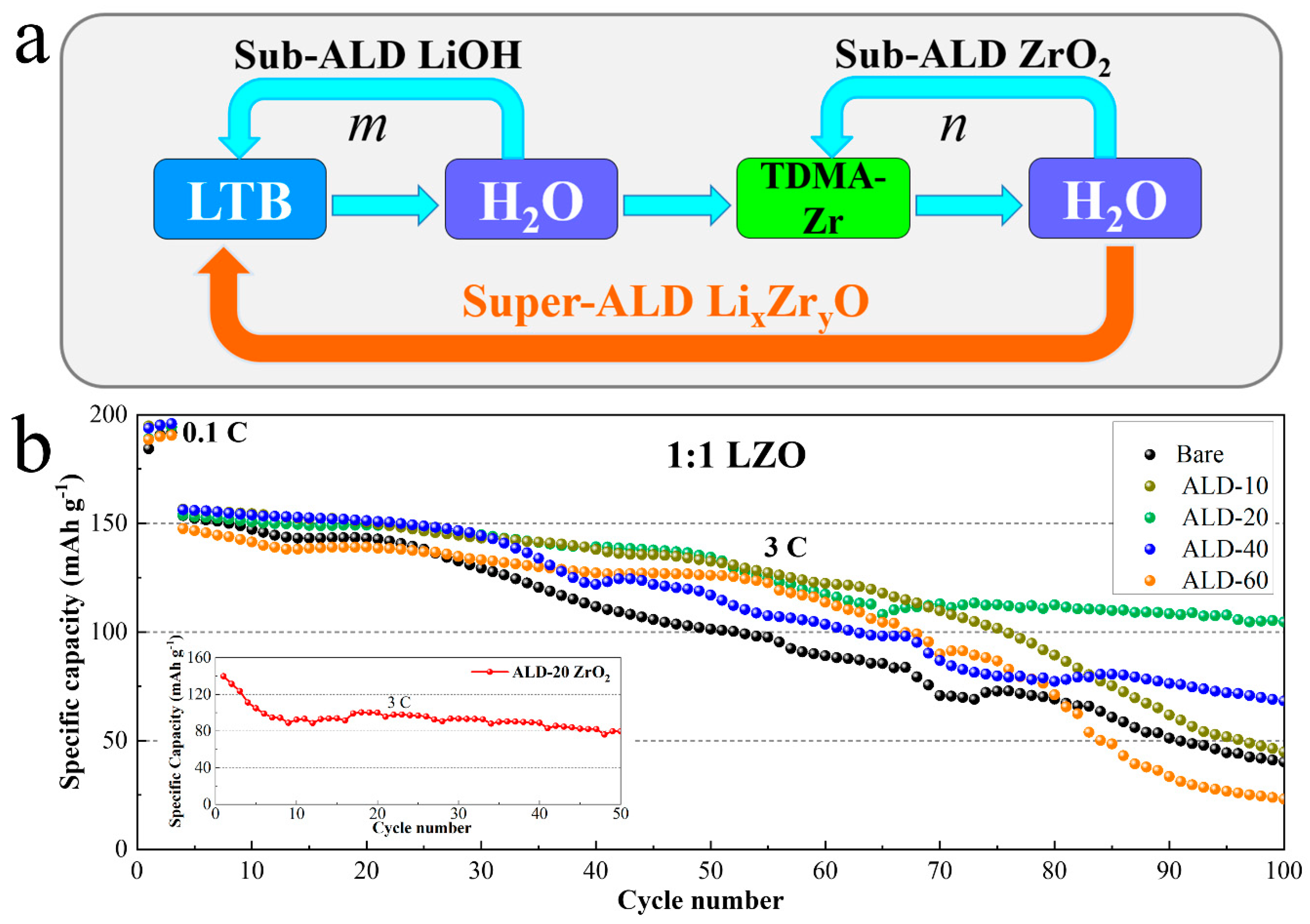 - Liu, Y.; Wang, X.; Ghosh, S.K.; Zou, M.; Zhou, H.; Xiao, X.; Meng, X. Atomic layer deposition of lithium zirconium oxides for the improved performance of lithium-ion batteries. Dalton Trans. 2022, 51, 2737–2749. [Google Scholar] [CrossRef] [PubMed]