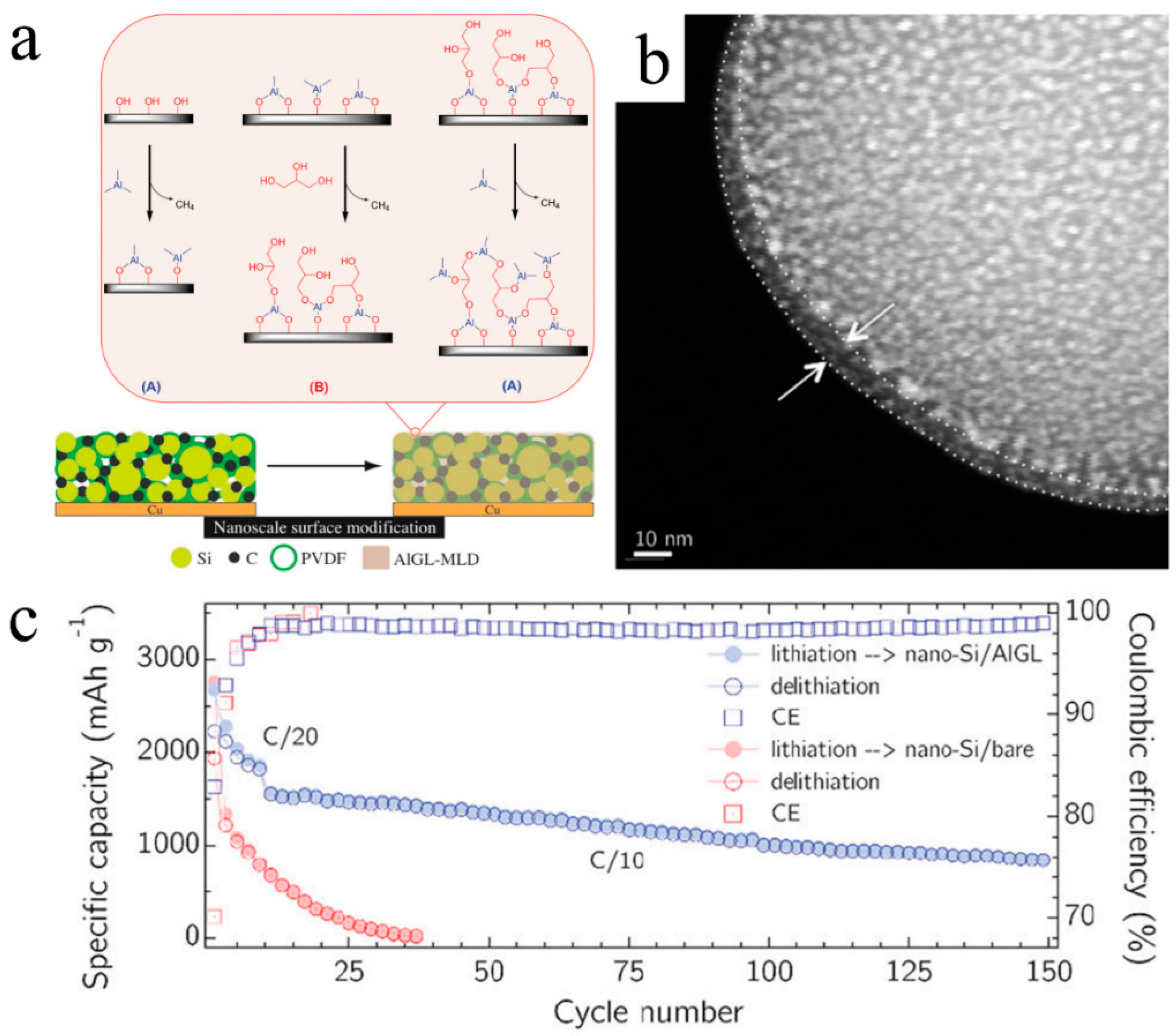 - Zhu, C.; Han, K.; Geng, D.; Ye, H.; Meng, X. Achieving high-performance silicon anodes of lithium-ion batteries via atomic and molecular layer deposited surface coatings: An overview. Electrochim. Acta 2017, 251, 710–728. [Google Scholar] [CrossRef]
