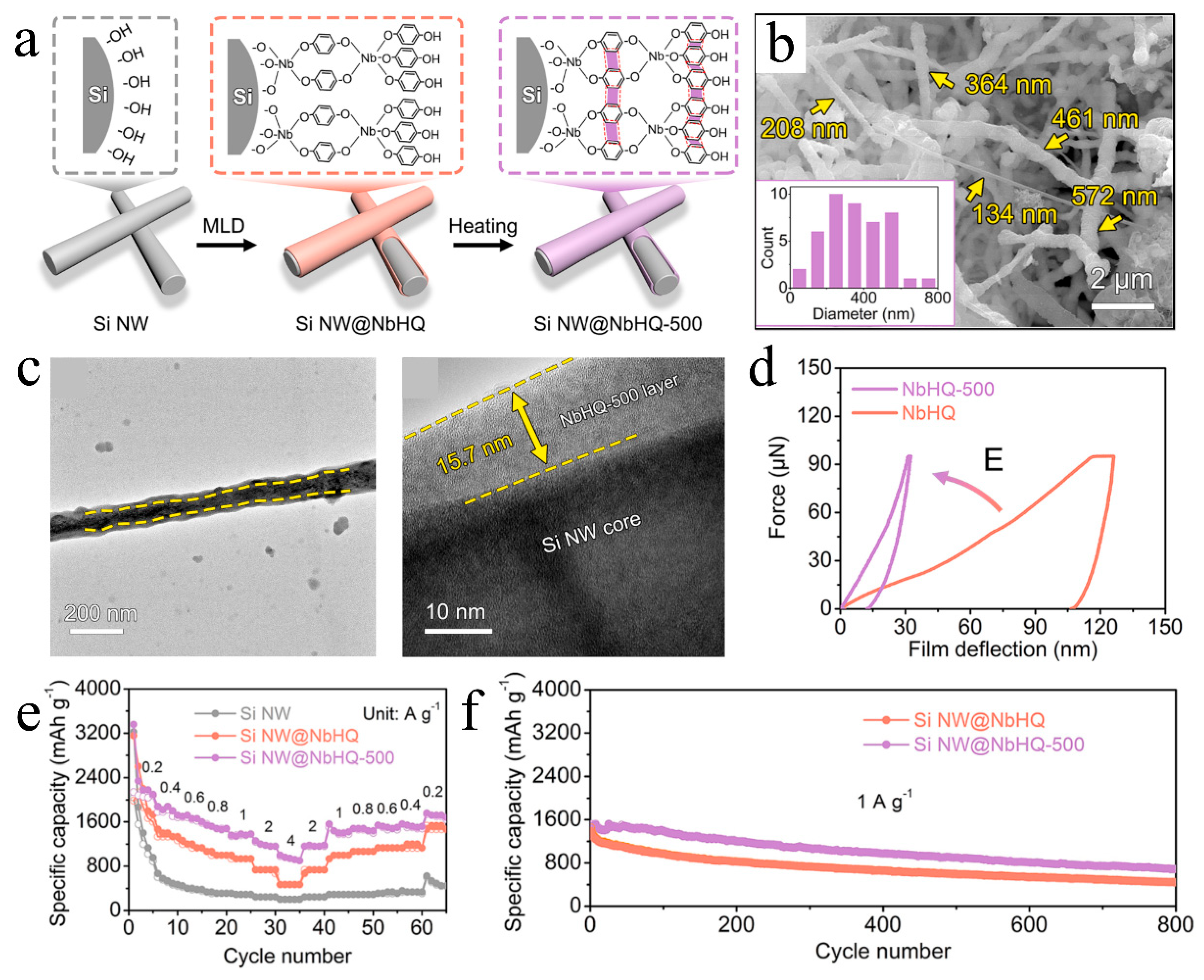 - Fang, J.; Li, J.; Zhang, W.; Qin, L.; Wu, K.; Hui, L.; Gong, T.; Li, D.; Hu, Y.; Li, A.; et al. Molecular layer deposited mechanically and chemically robust niobicone interface empowering silicon nanowire anodes with competent cyclabilities. Chem. Eng. J. 2024, 484, 149387. [Google Scholar] [CrossRef]