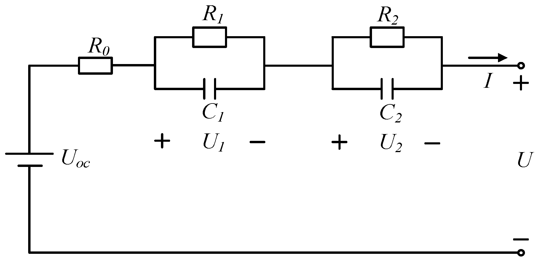 Among them, Uoc is the open circuit voltage of the battery. U is the terminal voltage of the battery; R0 is the ohmic resistance; I is the circuit current; R1 and C1, respectively, represent the electrochemical polarization resistance and polarization capacitance; and R2 and C2, respectively, represent the concentration difference polarization resistance and polarization capacitance [10].