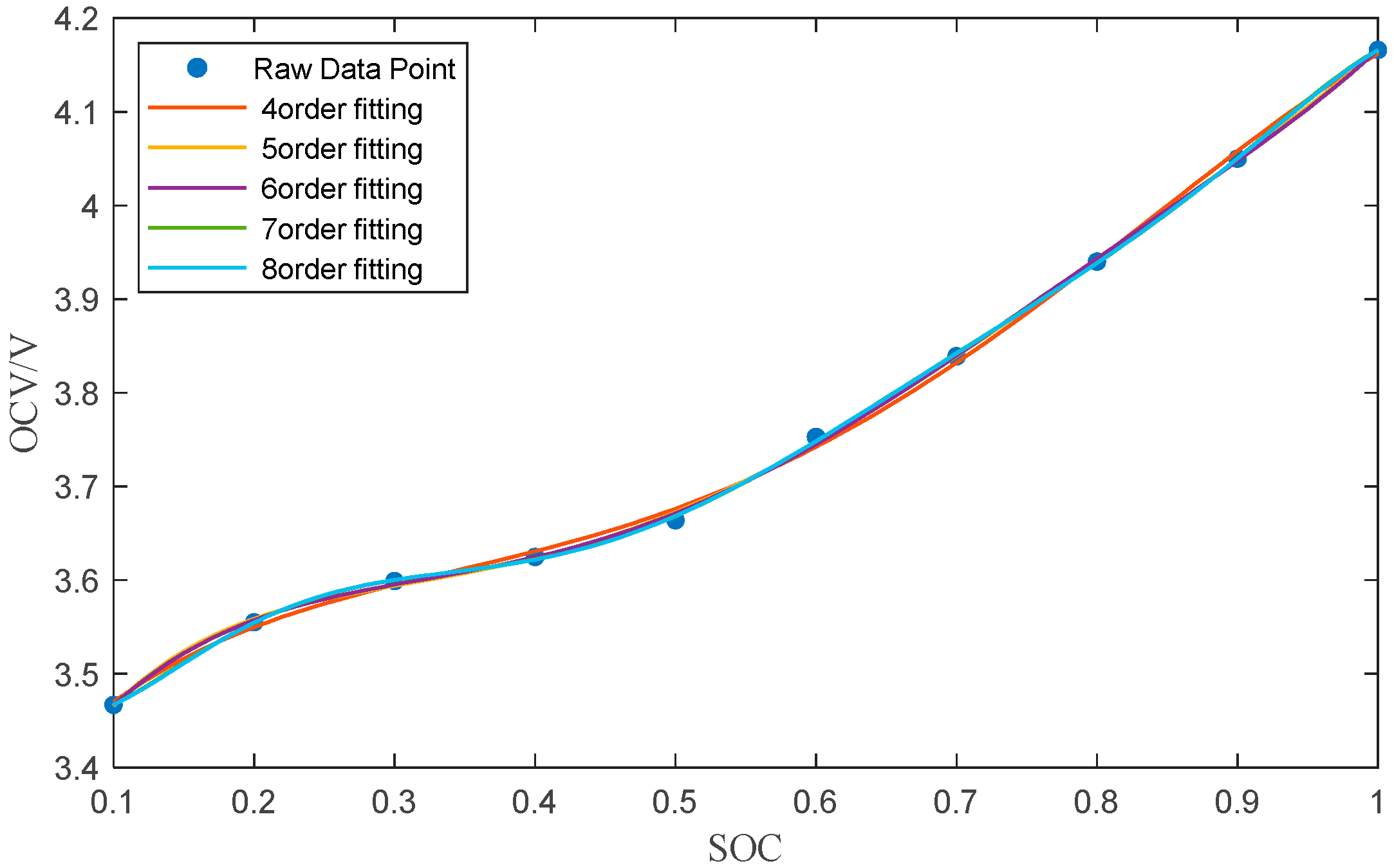 There is a nonlinear relationship between the battery SOC and open circuit voltage. Polynomial fitting of the OCV and SOC can accurately represent the relationship between the two. By reading the OCV value, the state of charge of the battery can be inferred. The experimental temperature is 25 °C, and the battery is discharged at a constant current of 1/20C for 12 min and left to stand for 2 h. After the battery is left to stand, the voltage of the battery will gradually approach the corresponding SOC value through an increasing stage. As the discharge progresses, the OCV values corresponding to different SOC points will be read until the end of the discharge [11]. The cftool function in Matlab is used to perform polynomial curve fitting on the read values and fitting the curve with polynomials of 4th to 8th order, respectively, to obtain the fitted function relationship between the OCV and SOC. The fitting result is shown in Figure 2.