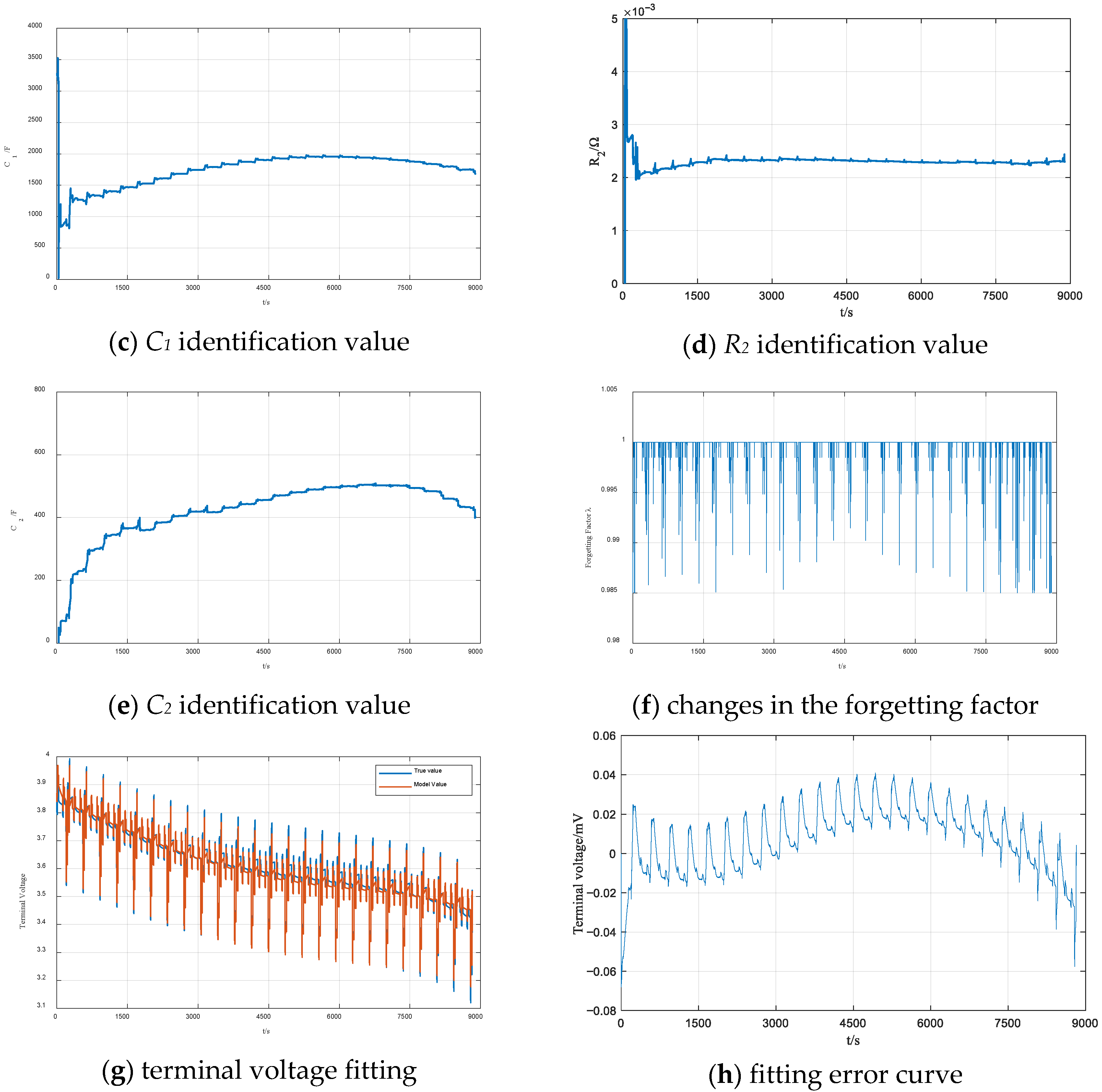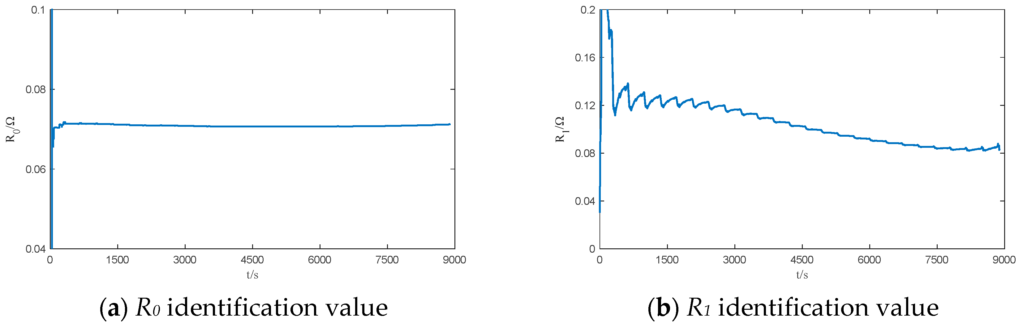 This article uses the publicly available dataset from the University of Maryland, which focuses on INR 18,650 lithium batteries with a rated capacity of 2 Ah [16]. The batteries are discharged using the City Road Cycle (FUDS) test condition at 25 °C, and data such as test time, battery voltage, and current are recorded during the process [17]. This operating condition simulates the complex road conditions of urban traffic, including multiple acceleration, deceleration, constant speed, and idle stages, which can better reflect the actual performance of the battery during use. The battery was also tested under dynamic stress testing (DST) conditions at 25 °C. This test simulates the impact of different driving stages, such as acceleration, constant speed, deceleration, and regenerative braking, on the battery to assess its performance. VFFRLS is used for the online parameter identification of recorded data. The initial SOC value of the battery in this dataset starts from 0.8. Considering that the battery life will be damaged when the battery power is below 10% in actual use, the SOC of the lithium battery in this article is kept at 0.1–0.8. The results of the online parameter identification of the battery are shown in Figure 4 and Figure 5.