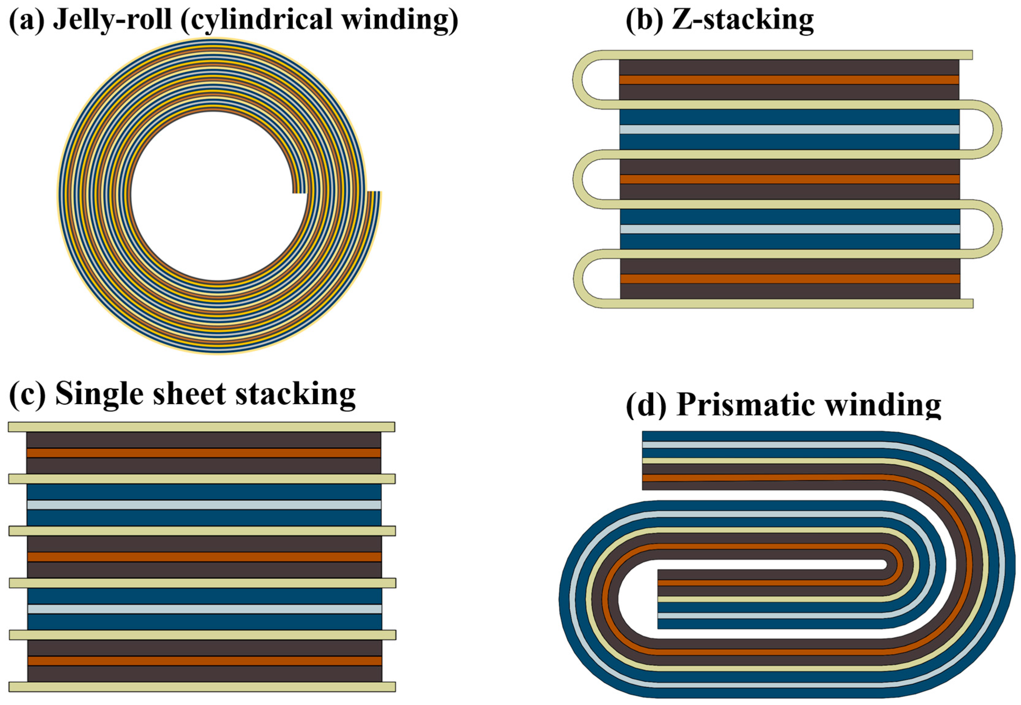 | Electrode arrangement | Wound (jellyroll) | Stacked/flat Jelly rolls | Stacked | [146,149,150] |
