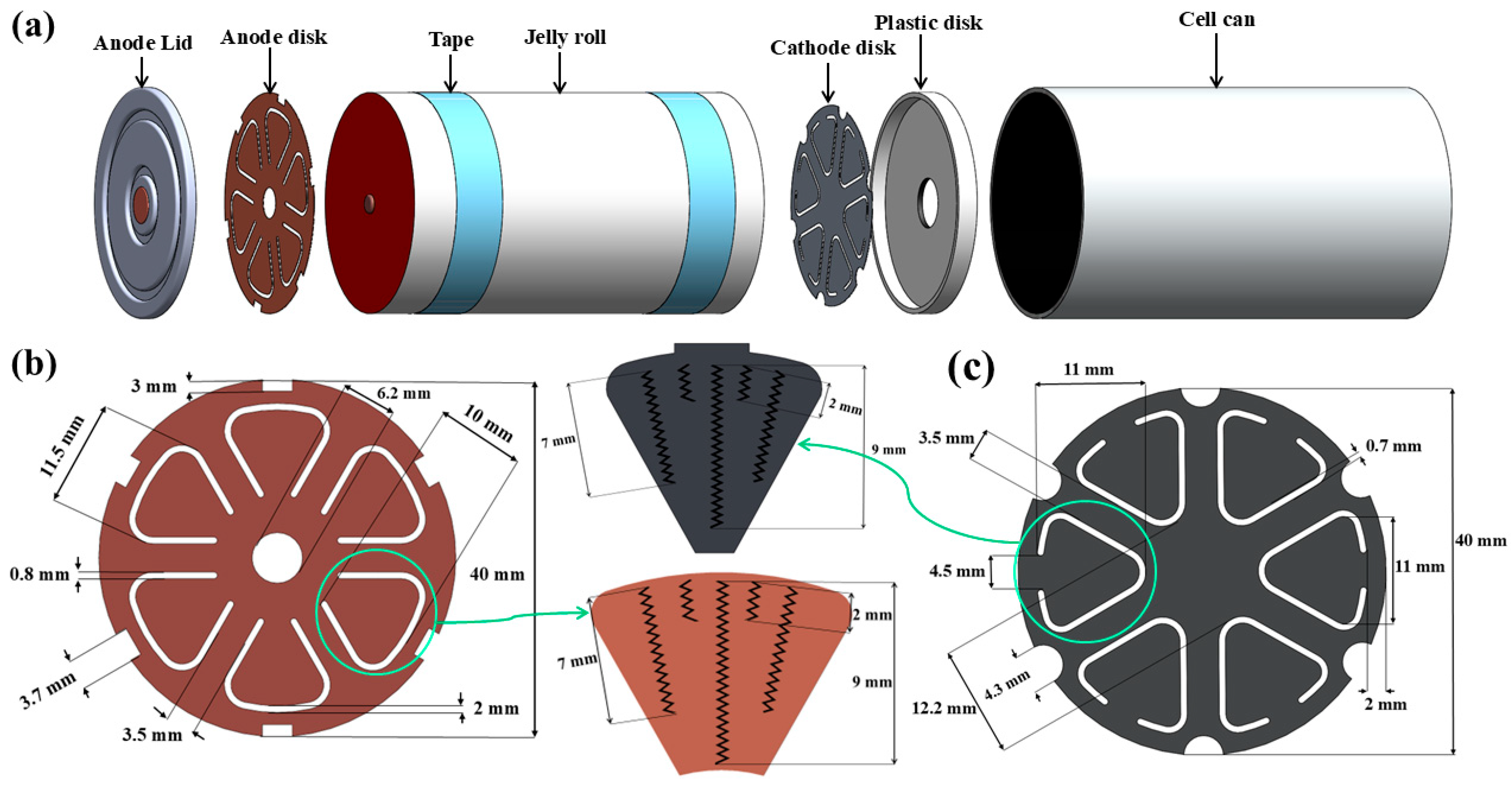 | Cylindrical higher effective path resistance unless mitigated. | Longer in-plane current paths in jelly-roll; single-tab causes uneven current lines | Use multi-tab or tabless collectors to reduce I.R and hotspots. | [177,198] |