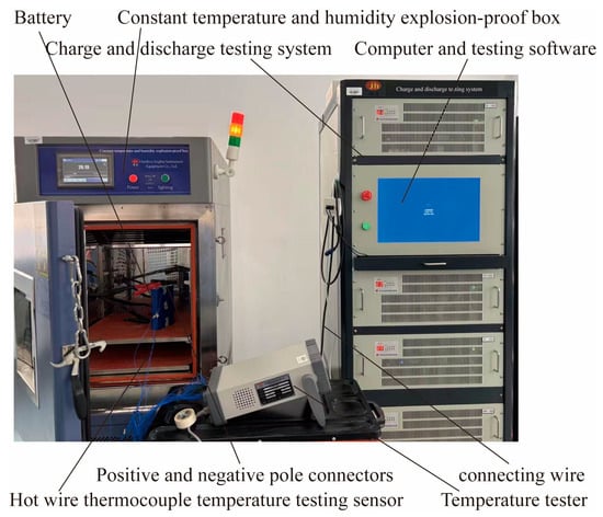 To validate the model accuracy, temperature measurement experiments were carried out on square single-cell lithium-ion batteries during charge–discharge processes. The single-cell batteries that were selected to use were LF50K square lithium-ion batteries produced by EVE Energy Co., Ltd. (Huizhou, China) The experimental plan and principle are shown in Figure 1 The experiment uses a battery charging and discharging testing system, a constant temperature and humidity explosion-proof box, a temperature tester, and other experimental equipment produced by Huizhou Jinghui Instrument Equipment Co., Ltd. (Huizhou, China). The battery charging and discharging testing system includes a testing computer and charging and discharging testing software; the test-ready battery shall be placed inside the explosion-proof constant temperature and humidity box located on the left, as shown in the figure. The outer and inner sides of the upper end of the battery are connected by positive and negative electrode connectors and their connecting wires, respectively; the end probe of the thermal-couple temperature measuring wire is contacted with the surface of the battery to be tested, and they are firmly stuck together with adhesive tape. The other end of the temperature measuring wire is connected to the temperature tester.