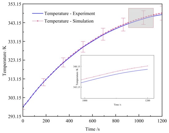 Figure 2 presents the experimental results of temperature variation over time alongside the simulation results. As observed in the figure, the maximum discrepancy between the experiment and simulation arises at 1200 s. At this time, the experimentally determined temperature is 348.19 K and the simulated temperature is 347.45 K, with a difference of 0.74 K and an error of 2.13%. The simulation model is reliable. Due to the optimal operating temperature range of batteries generally being 20 °C~45 °C, which is 293.15 K~318.15 K, reasonable heat dissipation should be carried out for the battery during 3C rate discharge to ensure that it functions within the optimal temperature range for operation. This article uses liquid cooling to dissipate heat from the battery.