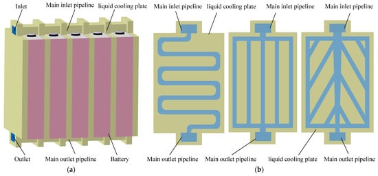 Three-dimensional model of lithium battery module cooling system: (a) structure of liquid cooling system; (b) liquid cooling channel scheme.