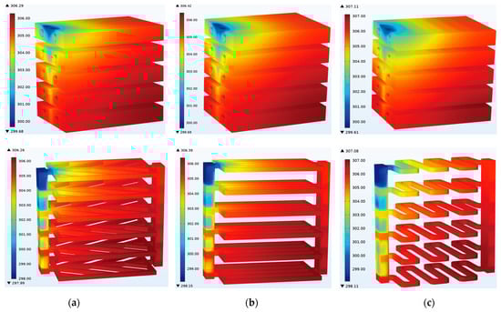 Temperature cloud maps of coolant and batteries with different channel structures: (a) vein channel; (b) direct flow channel; (c) serpentine channel.