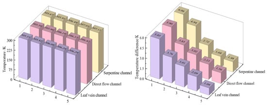 Figure 5 shows the maximum temperature and temperature difference of five batteries obtained through simulations under different channel structures. The numerical simulation analysis results of three different flow channels show that the serpentine flow channel scheme produces the maximum temperature with the highest numerical value, attaining 307.11 K, followed by the straight flow channel scheme, with a maximum temperature of 306.42 K, while the leaf vein flow channel scheme has the smallest maximum temperature, which is 306.29 K. From the perspective of temperature difference variation, all three different flow channels exhibit a consistent pattern: Battery 1 has the highest temperature difference, while Battery 5 has the lowest. Specifically, a gradual downward trend in the temperature difference in the batteries is observed as one moves from the top to the bottom. This phenomenon occurs due to the gradual decrease in the cooling efficiency of the coolant after it flows through the preceding channels, which in turn impairs its capacity to regulate the temperature of subsequent batteries. Notably, the decrease in cooling efficiency correlates with a diminished temperature difference. In terms of quantitative results, the serpentine channel demonstrates the maximum temperature difference, achieving 6.06 K. On the other hand, the minimum temperature difference is found in the biomimetic leaf vein channel for the No. 5 battery, which is 1.04 K. In summary, in terms of the maximum temperature, the relationship is Tmax (serpentine flow channel) (307.11 K) > Tmax (straight flow channel) (306.42 K) > Tmax (leaf- vein flow channel) (306.29 K); in terms of the temperature difference, the order is similarly ΔT (serpentine flow channel) > ΔT (straight flow channel) > ΔT (leaf vein flow channel). Therefore, the study in this paper tends to select the liquid cooling structure scheme with the leaf vein flow channel.
