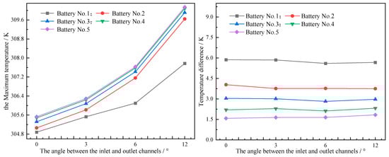 As illustrated in Figure 6, the batteries’ maximum temperature exhibits a positive correlation with the angle between the inlet and outlet channels. Specifically, it increases as the channel angle grows. As the angle increases, each battery’s maximum temperature rises progressively. At an inlet–outlet angle of 12°, the maximum temperature of Battery 5 measures 310.14 K. From the temperature difference curve, it can be noted that, under varying angles between the inlet and outlet, the temperature difference in the five batteries exhibits no obvious variation. This indicates that the inlet–outlet angle exerts only a minor effect on the temperature difference in each individual battery. Therefore, from the perspective of improving heat dissipation performance, a small angle between the inlet and outlet should be selected.