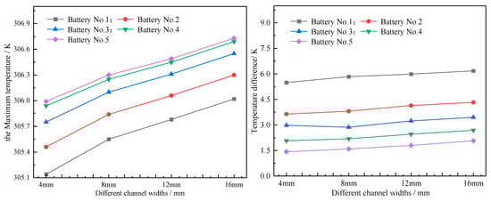 To evaluate the effect of the width of the flow channel on the cooling of power batteries, four structures were designed with flow channel widths B of 4 mm, 8 mm, 12 mm, and 16 mm. We set the liquid flow rate to 0.002 m/s, discharged the battery at a rate of 3C, and simulated the influence of channel width on cooling performance as shown in Figure 7. It displays the maximum temperature and temperature difference curves corresponding to various channel widths. As can be observed from these curves, both the maximum temperature and temperature difference exhibit a positive functional correlation with the channel width. Among them, the maximum temperature of Battery 5 is the highest, and, when the channel width is 4 mm, 8 mm, 12 mm, and 16 mm, the maximum temperatures are 305.99 K, 306.30 K, 306.49 K, and 306.73 K, respectively. Battery 1 has the maximum temperature difference, which is 5.49 K, 5.84 K, 5.99 K, and 6.18 K, respectively. Hence, from the perspective of achieving a reduction in the battery’s maximum temperature and temperature difference, an excessively large channel width is not recommended.