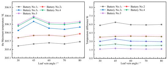 To investigate the cooling effect of the leaf vein inclination angle α on power batteries, five schemes were designed with leaf vein inclination angles α of 30°, 45°, 60°, 70°, and 80°, respectively. The battery underwent discharge at a 3C rate, with the coolant flowing at a rate of 0.002 m/s. The simulation results of the five different schemes are shown in Figure 8. As shown in the figure, for Battery 1 and Battery 2, the maximum temperature exhibits a gradual upward trend with the increase in angle, but the increase is not significant; for Batteries 3, 4, and 5, as the angle increases, the maximum temperature initially rises, subsequently decreases, and finally tends to stabilize gradually. When the angle reaches 45°, the maximum temperature is 306.58 K. An analysis of the temperature difference curve reveals that the temperature difference in Batteries 2–5 shows negligible variation with changes in angle, remaining nearly constant throughout. In contrast, for the first battery, the maximum temperature difference reaches 6.38 K when the angle is set to 45°. Overall, when the angle is 70°, the maximum temperature and temperature difference generated are the smallest. At this time, the maximum temperature of the No. 1 battery is 305.60 K, and the temperature difference is 5.92 K.